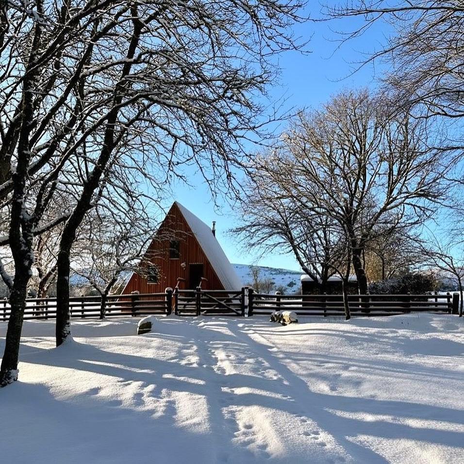 Indlu eyakhiwe ngamapulangwe engu-A-Frame, enezinkomo zase-Highland eduzane