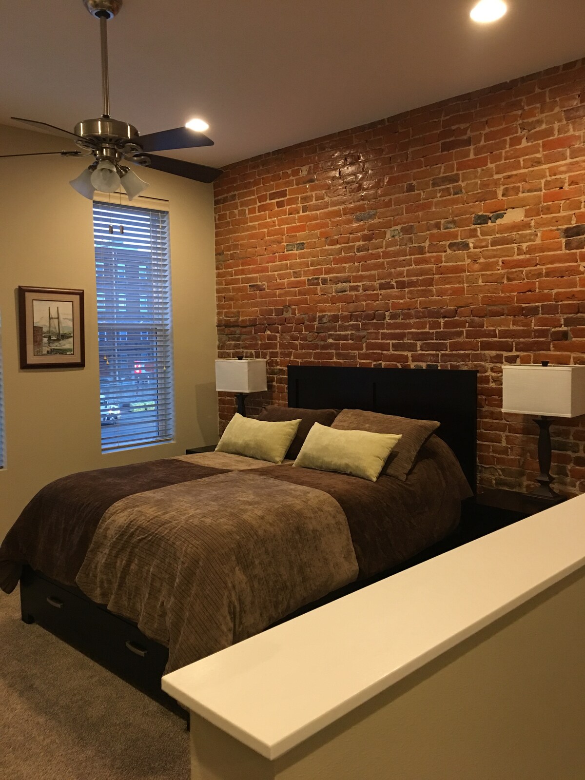 Izindonga zezitini eziveziwe. Umbhede othokomele kakhulu namashidi okubala izingxoxo angu-1200. AMA-TV ne-wifi engu-2. Umshini wokuwasha nowokomisa. Ikhishi ligcwele ngokugcwele. Itholakala e-Downtown Burlington 1 block ekha umfula i-Mississippi River. Ibanga lokuhamba ngezinyawo ukuya ezindaweni zokudlela eziningana nama-pub, i-Snake Alley(umgwaqo ogoso kunawo wonke emhlabeni), umtapo womphakathi, i-Sikhumbuzo Auditorium, ne-North Hill park.