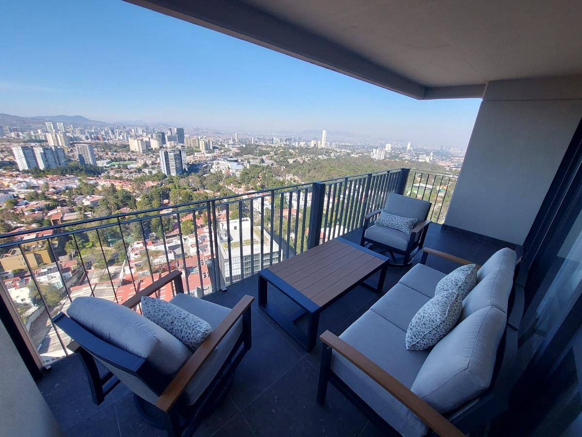 Phila e-Santa Fe ngesitayela. Hlala e-Vitant by Be Grand, phambi nje kwe-Parque La Mexicana. Ilungele uhambo lwebhizinisi noma ukuhlala isikhathi eside, ene-WiFi enejubane eliphezulu (100 Mbps), 55" i-Smart TV, nomklamo ogqugquzelwe yi-Bauhaus. Jabulela ukuvikeleka 24/7, indawo yokubhukuda, ijimu, izindawo zokubilisa inyama, nokunye. Izinyathelo ezisuka ezindaweni zokudlela, i-Starbucks, i-Walmart, i-Sam's nemizuzu evela ezinkampanini ezihamba phambili, i-Tec de Monterrey, i-Ibero, ne-Centro Comercial Santa Fe.