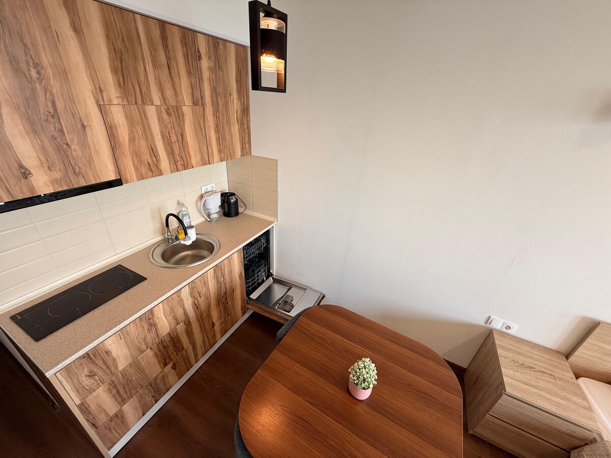 Ezinhle, ezinomoya oshisayo, ezinakho konke, ikamelo lokulala elilodwa, igumbi lokugezela eliyi-1 negumbi lokuphumula elinefulethi lasekhishini elivulekile esitezi sama-21, imizuzu engu-5 ukuya olwandle ngezinyawo, elise-New Wave hotel complex. Ifulethi linefenisha yesimanje, lilungele imibhangqwana, abangane, imindeni, noma izisebenzi ezikude nezihambi zebhizinisi. Esakhiweni kunamasevisi engeziwe atholakalayo ngezindleko ezengeziwe njengendawo yokubhukuda, indawo yokuzivocavoca nendawo yokudlela.