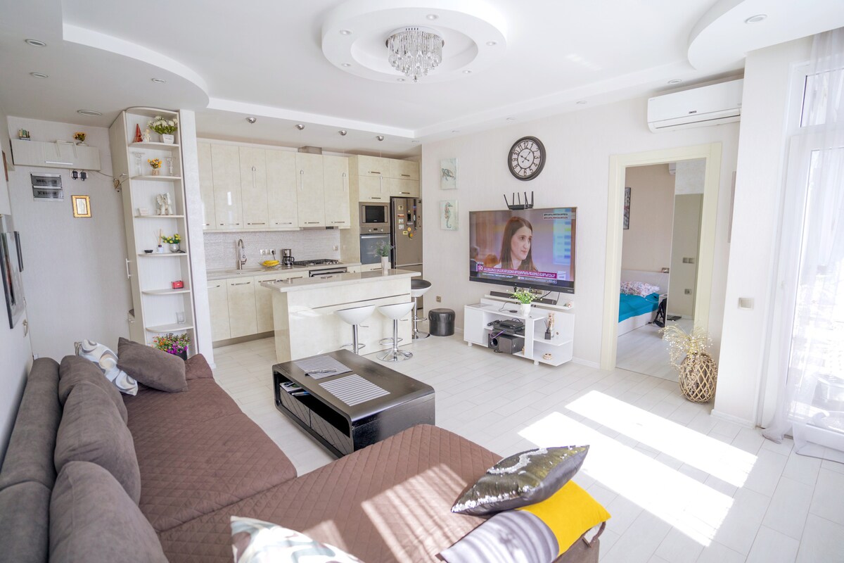 Istudiyo esibukekayo esinezindawo ezinhle zechibi, imithombo yokucula, i-boulevard nolwandle. Konke kuhlanzeke kakhulu, kuhlanzekile futhi kusezingeni eliphezulu, ukuze unethezeke kakhulu. Ifulethi likwelinye lezindlu ezinhle kakhulu e-Batumi, indlu inendawo yokubhukuda, indawo yokuzivocavoca ne-spa, ukufudumeza igesi. Ukushona kwelanga okungenakulibaleka efasiteleni kuzohlobisa ubusuku bakho.