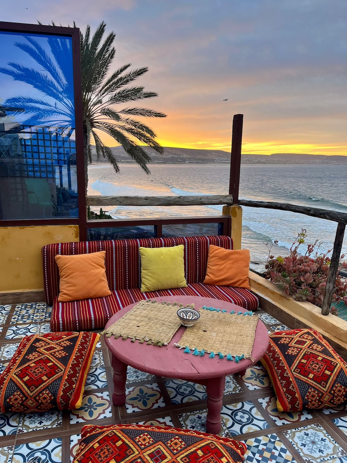 C'est le seul appartement dont le balcon est construit au dessus du chemin qui longe la plage, offrant une vue exceptionnelle sur les vagues, le village, les pêcheurs, les surfeurs (devant le spot Hash point). Très confortable, décoré et entretenu avec soin pour un séjour exceptionnel au dessus de l'océan, proche des nombreux cafés et restaurants longeant la plage et à 2 pas des écoles de surf, au coeur de ce village berbère convivial mêlant pêcheurs, commerçants, surfeurs du monde entier.