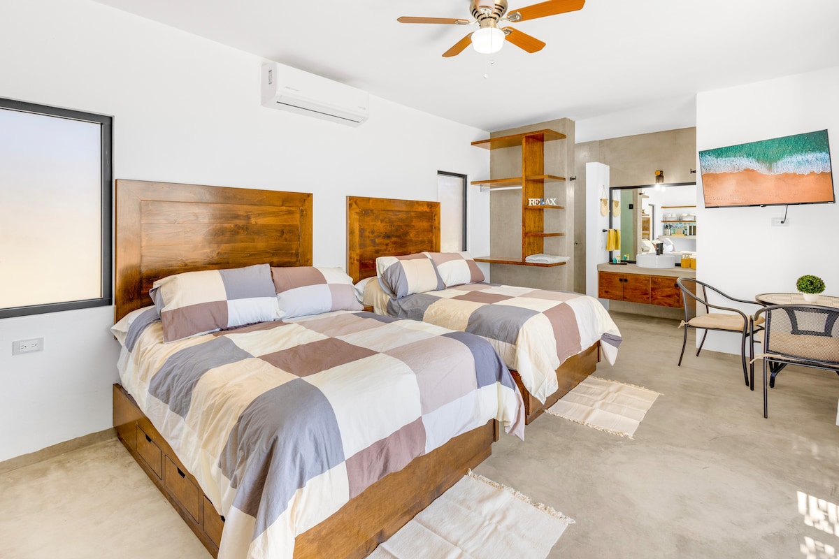 Agua is a peaceful second-level suite designed for your ultimate comfort. At 30 m², it features breathtaking ocean and mountain views from the kitchen and private terrace. Relax in soft lounge chairs or enjoy a meal at the dining table with panoramic views of Bahia La Ventana. The luxuriously comfortable king bed invites restful sleep, while the fully equipped kitchen with mountain views makes cooking a joy. High-speed WiFi ensures you stay connected, and all the local activities—from beach walk