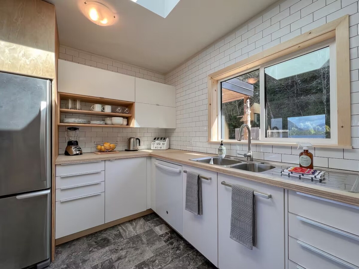 Ikhaya elimangalisayo lehlathi eligcwele ukukhanya elinemizila yemifula ehlanzekile eqhele ngezitebhisi. Ikhishi le-w/ chef eliklanywe ngobuciko, imibhede ye-premium, namafasitela asuka phansi aya ophahleni afaka izihlahla ezinde. Jabulela igceke lakho elikhulu elibiyelwe eliphrayivethi elinendawo yokubasa umlilo nokudla kwangaphandle. Kunokuthula futhi kunokuthula kodwa kuyimizuzu engu-15 ukuya e-Courtenay & Cumberland, engu-25 kuya e-Mt Washington. Ilungele imindeni nezinja. "Lokhu akuyona nje i-Airbnb; okokuzithokozisa okuhlelwe kahle." - UNina ★★★★★ "Indawo emangalisayo, eyingqayizivele" - I-Caitlin ★★★★★