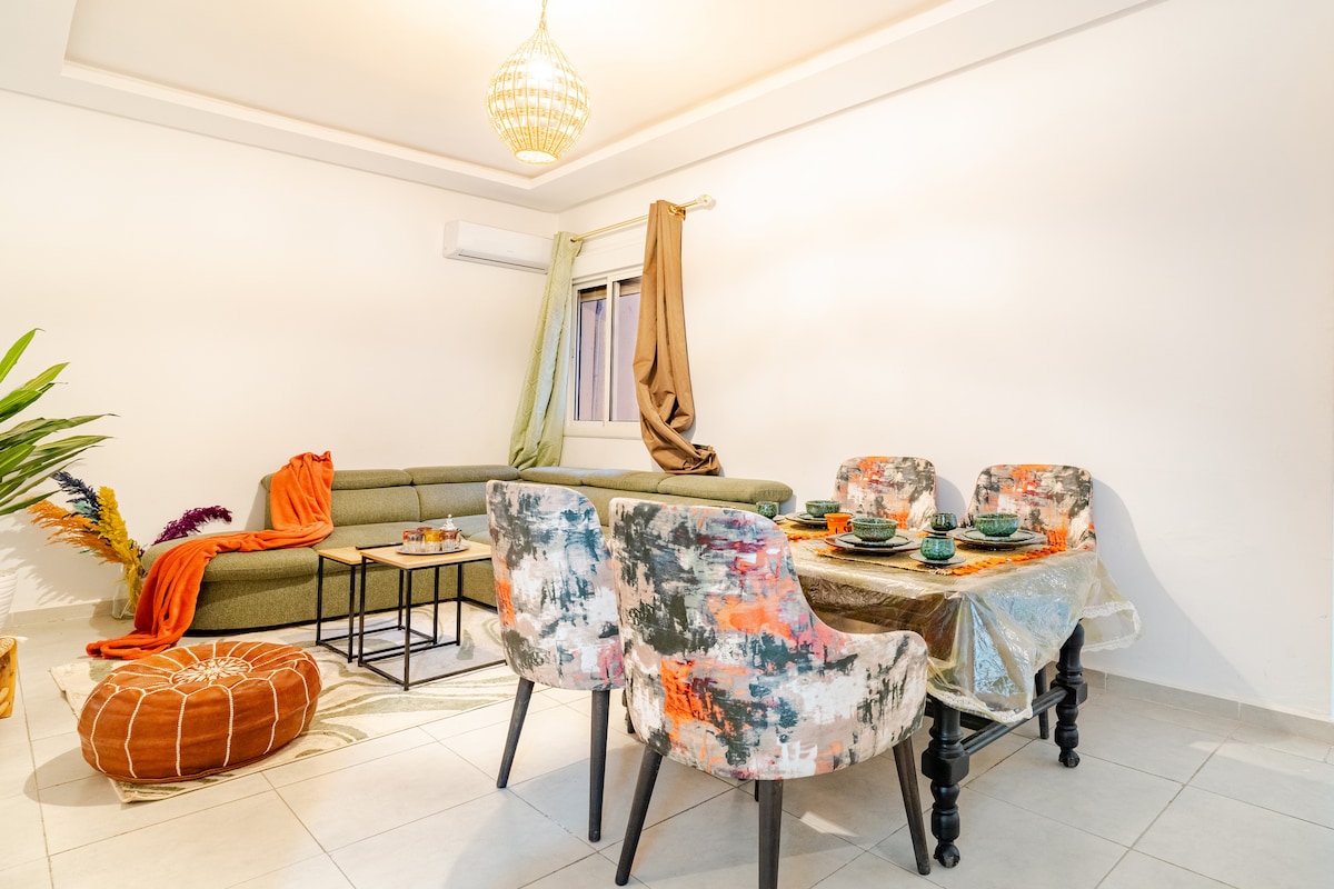 Siyakwamukela efulethini lethu lesimanje nelikhanyayo, eline-elevator emizuzwini engu-5 ukusuka esikhumulweni sezindiza sase-Marrakech. Ilungele uhambo lwebhizinisi, ukuthutha noma amaholide, inikeza indawo enokuthula nenomshini ophelele: igumbi lokuphumula lase-Morocco eline-Smart TV (Netflix), ikhishi eliphelele, amakamelo okulala amabili athokomele, i-Wi-Fi esheshayo, indawo yokupaka yamahhala, (ibhokisi lesikhiye)