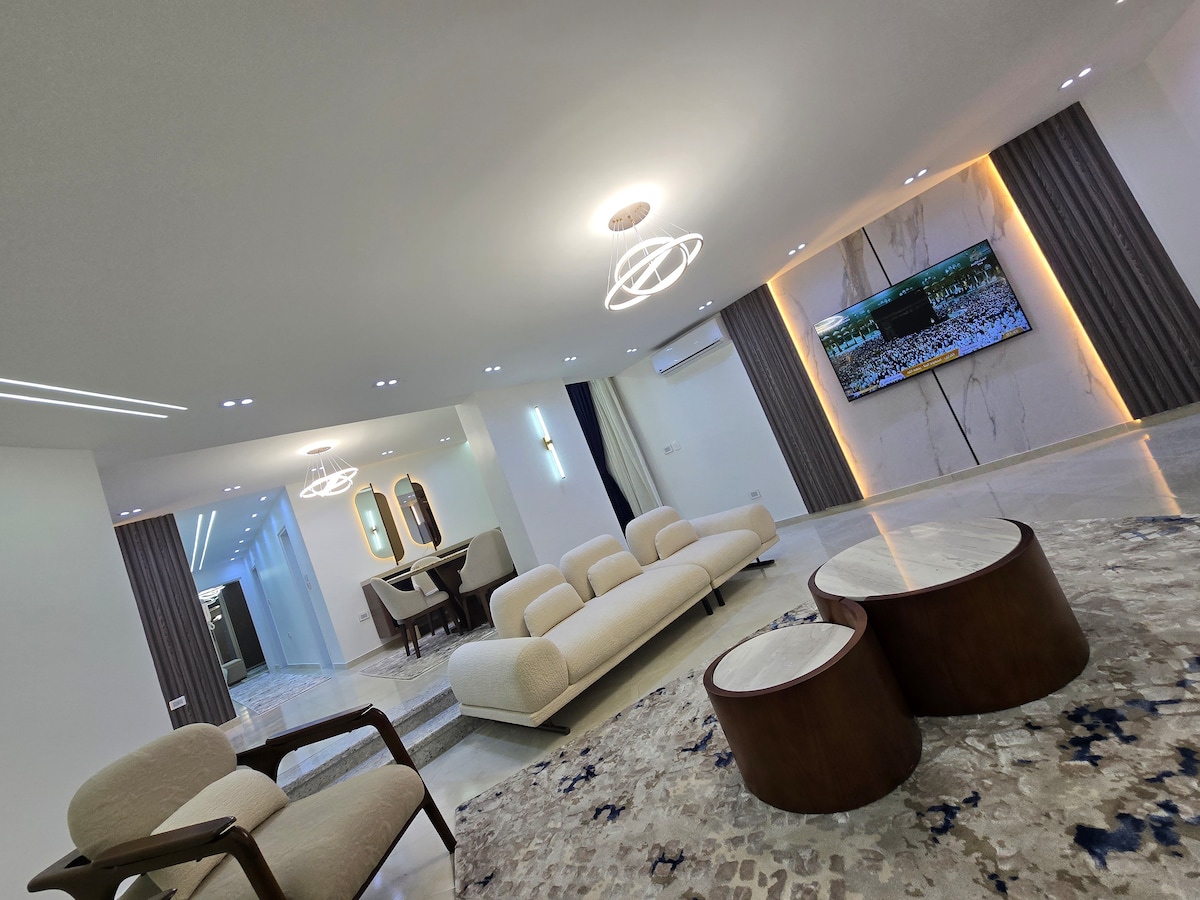 شقة فندقية فاخرة 3 غرف نوم بتصميم مودرن، صالة واسعة، مطبخ Fully Equipped، وحمامين حديثين. موقع Prime Location بمدينة نصر بجوار سيتي ستارز، مثالية للعائلات وتوفر راحة وخصوصية وLuxury Stay. A modern 3BR Luxury Apartment in Nasr City with an elegant living room, Fully Equipped Kitchen, and 2 Modern Bathrooms. Perfect for families seeking comfort and a premium stay near City Stars