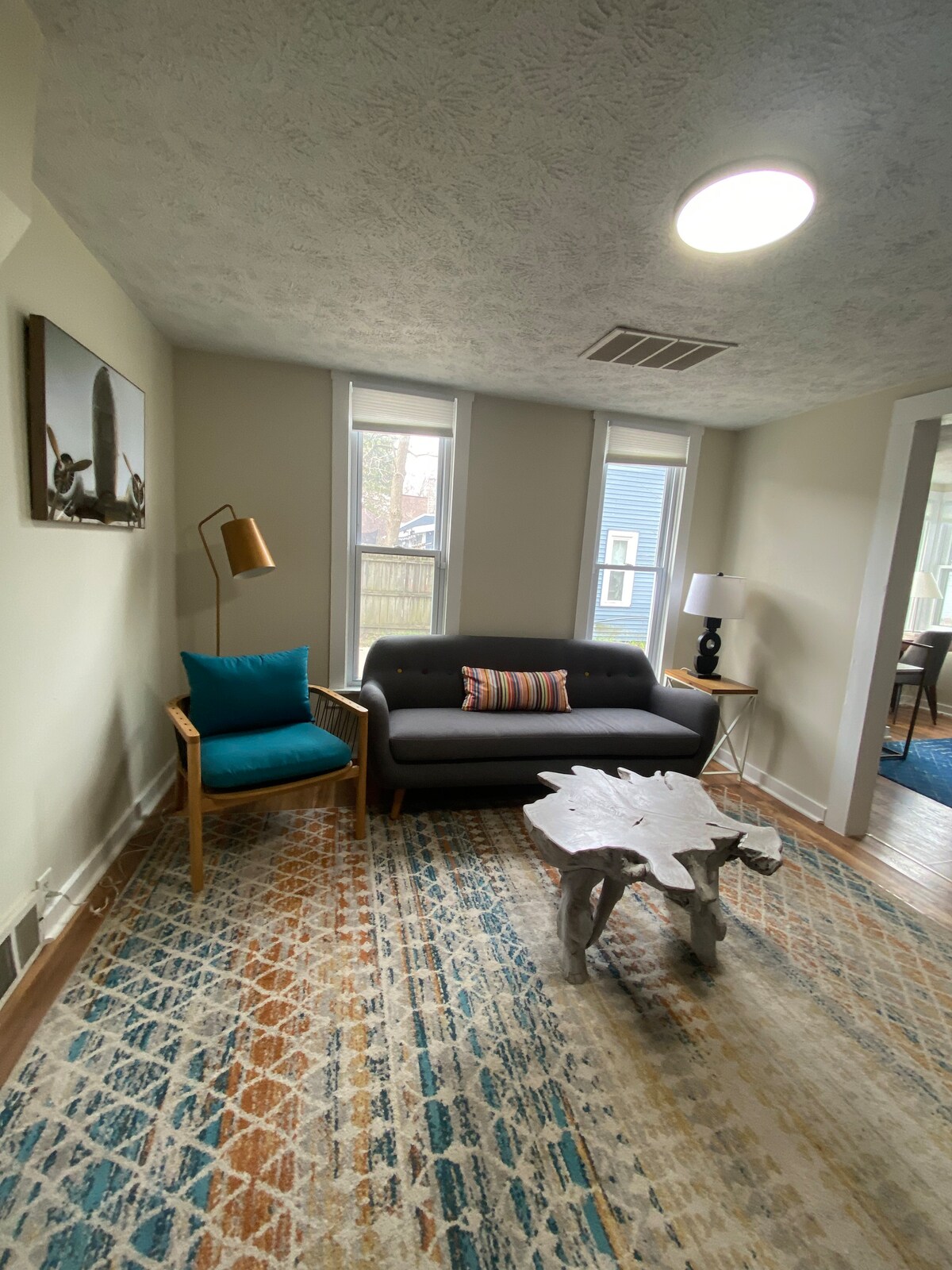 Apartment 2 is the upper unit of a two-unit home, offering a cozy stay full of historic character. Accessible by a flight of stairs, it has it’s own private entrance & a bright sunroom with original windows. The full kitchen features an original built-in. Enjoy original hardwood floors, beautiful woodwork & a clawfoot tub perfect for relaxing soaks. Ample closet space, 680 thread-count sheets & blackout blinds. Ideal for guests who appreciate historic charm & a welcoming home away from home.