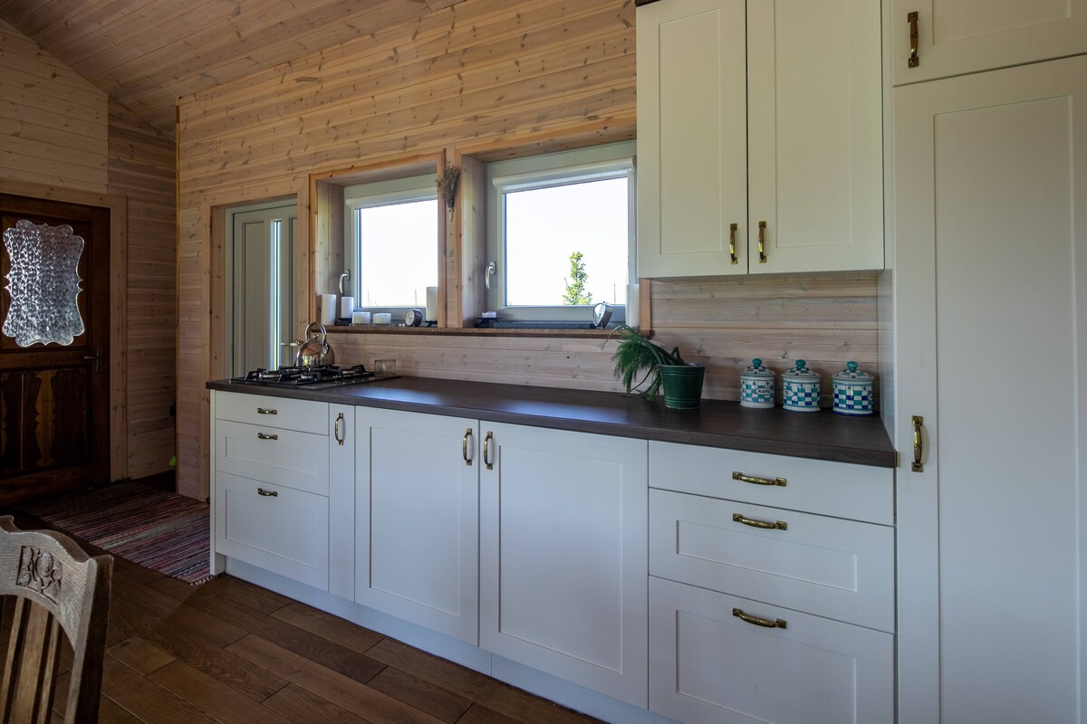 Indlu yesawuna yesimanje ethokomele emvelweni yezivakashi ezingaba ngu-4. Imibhede emibili, i-sauna yomthi eyimfihlo, indawo yokubasa ethokomele, nendawo yokuhlala eyimfihlo. Amafasitela amakhulu abheke amahhashi nehlathi elithulile lamapayini. I-Wi-Fi esheshayo, ukushaja i-EV, ukugibela amahhashi endaweni. Amakhilomitha angu-10 ukuya e-Germanto Nature Preserve, amakhilomitha angu-20 ukuya e-Žemaitija National Park.
