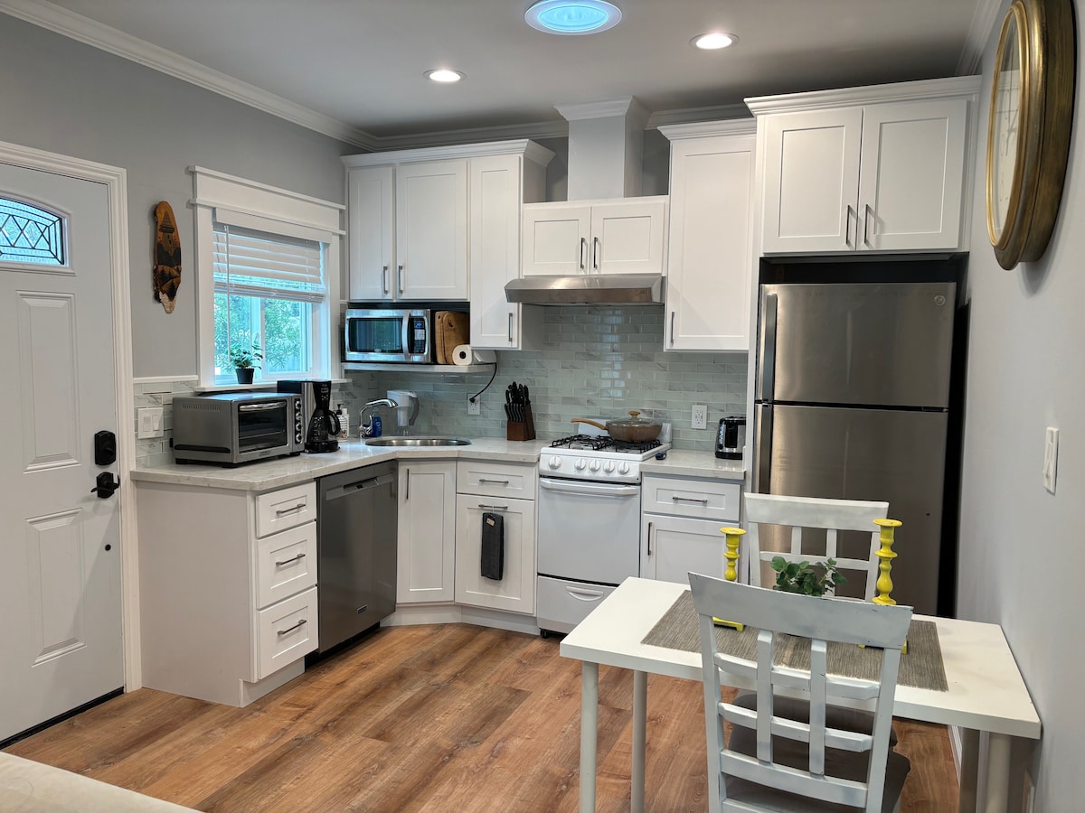Newly updated! New photos will be up soon. Detached guest house with lots of amenities including a full kitchen, living room, bathroom, and separate bedroom. The space has AC and Heater in both the living room and bedroom. Living room and bedroom comes with a flat screen TV to watch all your favorite shows. Includes Netflix, Hulu, and Amazon Prime Video. Kitchen includes a fully stocked Keurig, full size refrigerator, hot water kettle, microwave, and of course - a full stove