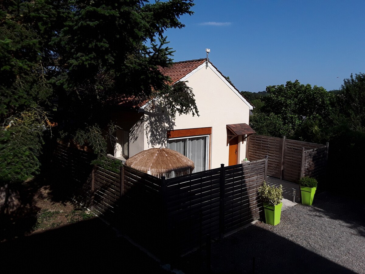 Indlu encane ebukekayo ezimele, kuhlanganise negumbi lokuphumula elingu-1 elikhulu elinosofa oguqukayo, ikhishi elilodwa elinakho konke i-bar, uhhavini, umshini wokuwasha izitsha, ifriji, i-microwave, Ikamelo lokulala eliyi-1 i-mezzanine livulekele igumbi lokuphumula elinombhede ongu-1 ku-160, Igumbi le-shower eliyi-1 elineshawa nendlu yangasese. I-Flat screen TV, i-DVD player, i-hi fi channel, imidlalo yebhodi, izincwadi, i-cd, i-DVD, umshini wokuwasha. I-WiFi Wooded land. Indawo ethulile neyi-bucolic... I-terrace enhle ene-barbecue, ifenisha yengadi. Umbhede wenziwe ekungeneni.