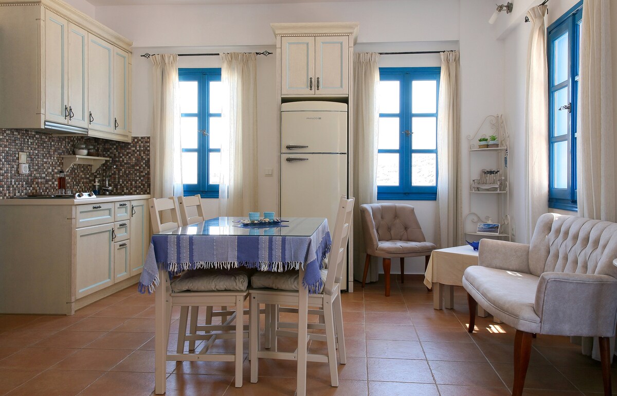 Indlu ethokomele ebheke ebhishi elihle lasehlane lase-Tyrokomos. Indawo yokuphumula efanele amaqembu abangane abafuna indawo yokuhlala ngaphandle kokunqatshwa ukuhlala okulula. Ufika usuka echwebeni emizuzwini eyishumi kuya kweyishumi nanhlanu.