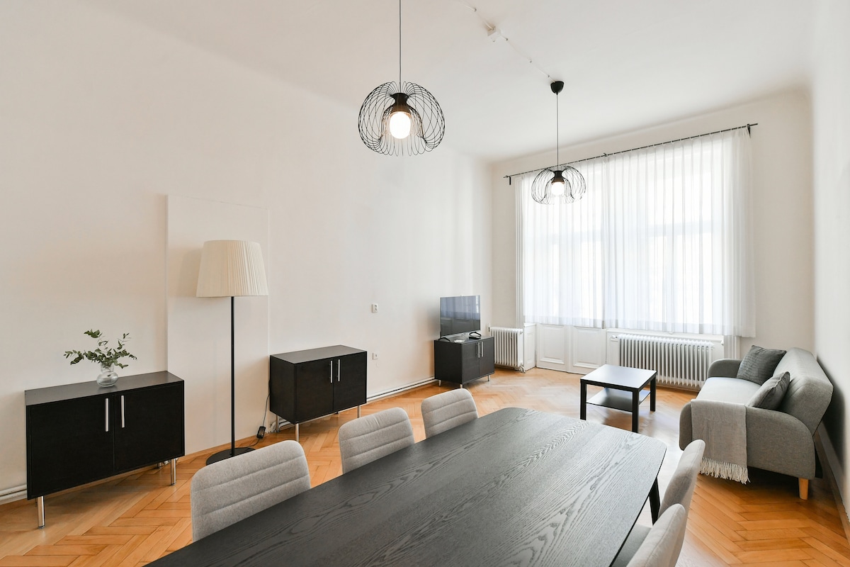 Our apartment is on quite street in historical center of Prague. Just few steps from river, between National Theater and famous Dancing House, 10 minutes walk from Charles bridge and Old Town square. With high ceilings and wooden floors, spacious and bright, will welcome you with warm and cozy atmosphere. We will be happy to make our guests feel like at home!