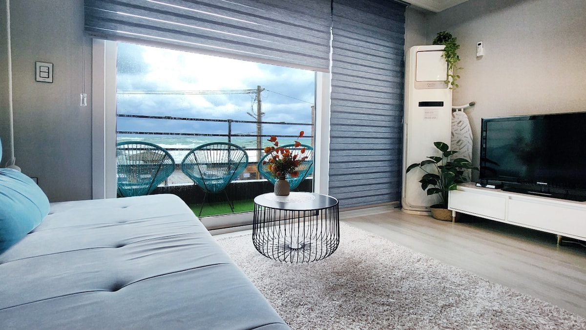 Sawubona. Sifuna ukwakha indawo ekuvumela ukhohlwe ubuhle edolobheni ngokusebenzisa umsindo wamagagasi olwandle. Indawo yethu, etholakala emizuzwini engu-20 ukusuka esikhumulweni sezindiza, ivumela wonke amakamelo ukuba abone ulwandle oluhlaza okwesibhakabhaka lwe-Jeju phambi kwakho. I-Space Composition 12 pyeong isikhala esitezi sesithathu (usebenzisa ikheshi) 1. Isikhala sekamelo lokulala: Igumbi liyindawo yokuziphekela ekamelweni elilodwa. Umbhede, i-TV efakwe odongeni, itafula letiye netafula lokudlela labantu ababili, isiphanyeko, ukuma, usinki, i-air conditioner, ifriji elincane (ifriji elihlukile), i-induction 2. Ikhishi: Izinto zetafula nezinto zasekhishini zabantu abangu-2 3. Indlu yokugezela: I-sunflower shower, ithawula, i-shampoo, i-conditioner, ukugeza umzimba, insipho, iphepha lasendlini yangasese (Sicela uqonde ukuthi amabhulashi okuxubha amazinyo awakwazi ukunikezwa ngenxa yemithetho yokuphatha inhlanzeko.) 4. Terrace 5. Indawo ye-Barbecue Indawo yokosa inyama yolwandle exhunywe olwandle: u-20,000 won (amalahle ne-grill ayatholakala.) Kunendawo ehlukile yokosa eceleni kwendawo yokwamukela izivakashi, ngenxa yesimo sezulu esimvula. 6. Indawo yokupaka: Indawo yokupaka kagesi ikhona. 7. Sicela ucele igumbi lelondolo nomshini wokomisa ngokwehlukana endaweni yokungena esitezi sokuqala. Siyabonga.
