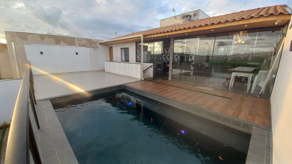 Ikhaya lenkathi yonyaka e-Alfenas! Indlu inamakamelo okulala angu-4, angu-2 awo angamakamelo, igumbi lokugezela lomphakathi, nezindlu zangasese. I-air conditioning kuwo wonke amagumbi! IHholo Lamaphathi elinendawo yokudla. Indawo yokubhukuda negalaji! Qaphela: indlu inezinto zokupheka eziyisisekelo kuphela!