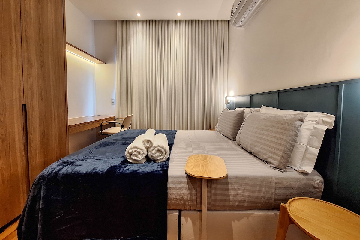Istudiyo esithandekayo nesithulile esingu-25m2, esinakho konke, esinekhishi elivamile eliphakeme, igumbi lokugezela nekamelo lokulala, nefasitela le-acoustic elincishisiwe ngo-95% womsindo wangaphandle. Istudiyo sihlakaniphe ngokuphelele futhi siyayiphendula imiyalo yezwi (i-TV, umsindo, izinga lokushisa nokukhanya). Itholakala enkabeni yebhishi lase-Copacabana, indawo yethu nayo ihamba ngezinyawo imizuzu embalwa ukusuka ebhishi lase-Ipanema, izitolo ezinkulu, isitimela esingaphansi komhlaba kanye nenqwaba yamabha nezindawo zokudlela, ngesitayela esihle kakhulu sase-Rio!