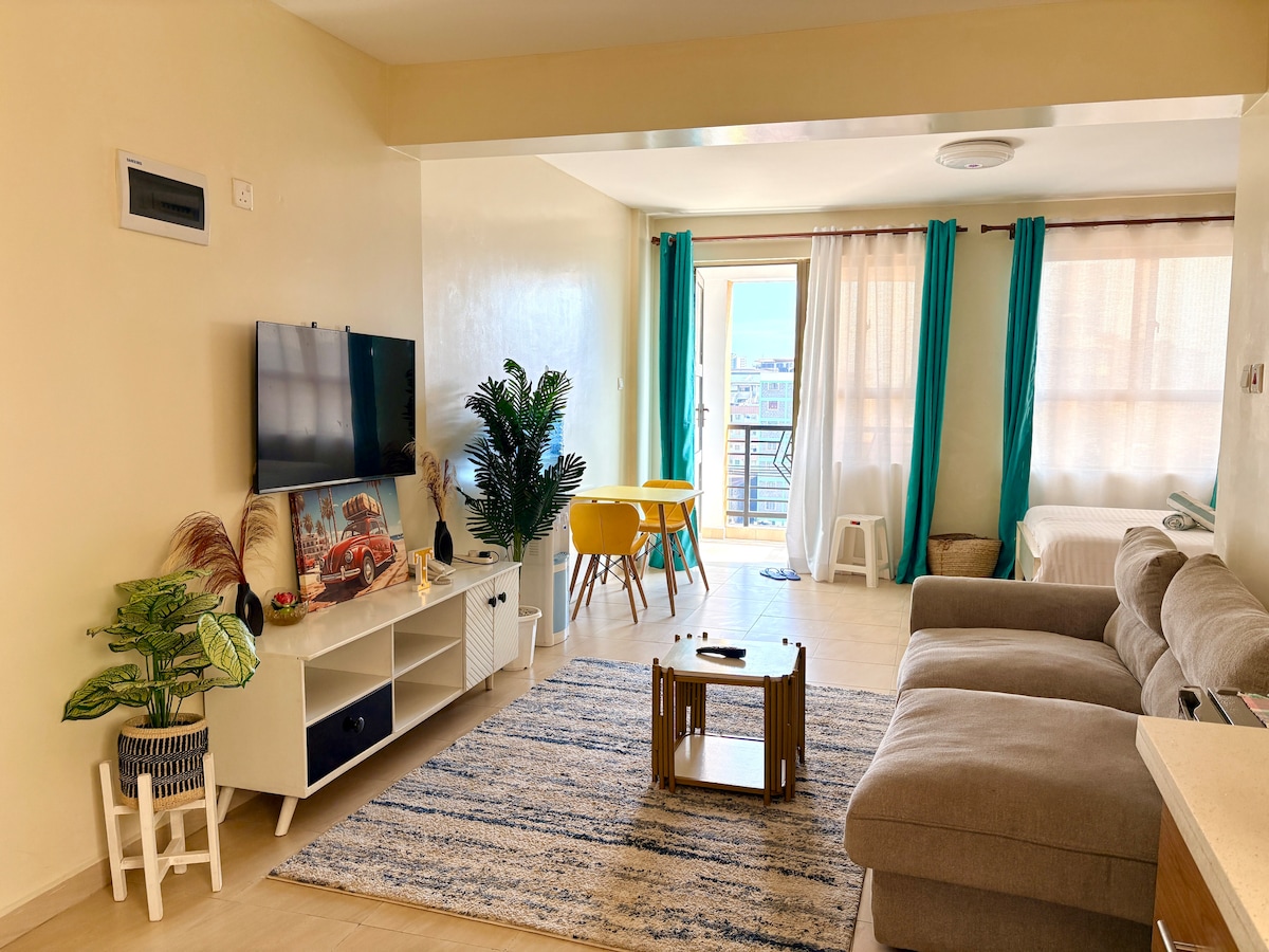 Karibu efulethini lakho elikhanyayo elivulekile elithokomele elilungele ukuhlala noma ukuhlala isikhathi eside. Kungamakhilomitha angu-8.7 ukusuka e-JKIA, angu-3.9 ukusuka e-SGR, angu-3.3 ukuya ku-Expressway exhunywa e-Westlands eqhele ngamakhilomitha angu-19 (kukhona izindleko zokukhokha), kanye namakhilomitha angu-1.8 ukuya e-Gateway Mall. Kuphephile ukungena ngisho nasezinzulwini zobusuku ngezokuvikeleka ezingama-24/7, ikheshi nokungena nge-keypad. Inayo i-Wi-Fi esheshayo, i-generator eyibhekhaphu, umbhede omkhulu, indawo yokusebenzela, ikhishi lesimanje, ukuvunyelwa kwamahhala ejimu nasephuli kanye nokuhlanza indlu kwamahhala. Jabulela ikhofi netiye lethu laseKenya.