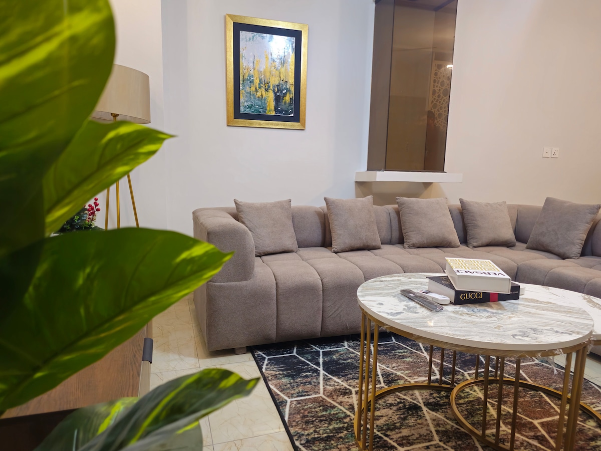 Ifulethi lethu elinekamelo elilodwa lihlanganisa isimo sesimanje, ukunethezeka nokunethezeka. Indawo yokuhlala enefenisha ephelele, enokukhanya okwanele enefenisha yesimanje, ikamelo lokulala elithokomele, nekhishi lesimanje elinazo zonke izinto ezibalulekile. Phuma uye ezindaweni zokudlela, ezitolo zokudlela, nasezitolo zokuthenga, konke okuqhele ngezinyawo. ✅ Ibungazwa uMbungazi ovelele wezinkanyezi ezingu-5 Ukuvikeleka ✅ 24/7 & Ukubhekwa kwe-CCTV Indawo Yokupaka ✅Yamahhala Isikhumulo sezindiza semizuzu ✅engu-15 Ilungele abantu abahamba ngebhizinisi, imindeni emincane noma izivakashi ezihamba zodwa ezifuna okokuzithokozisa kwe-premium enkabeni ye-DHA.