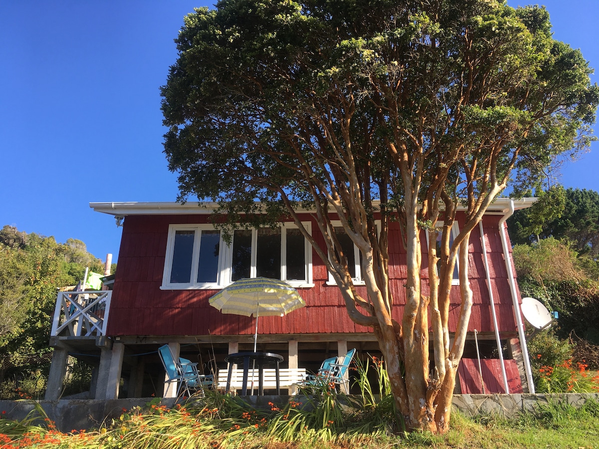 Acogedora cabaña con vista al mar equipada para 6 personas. Dispone de terraza y sitio amplio con jardín y estacionamiento. Acceso: recomendable vehículo 4x4