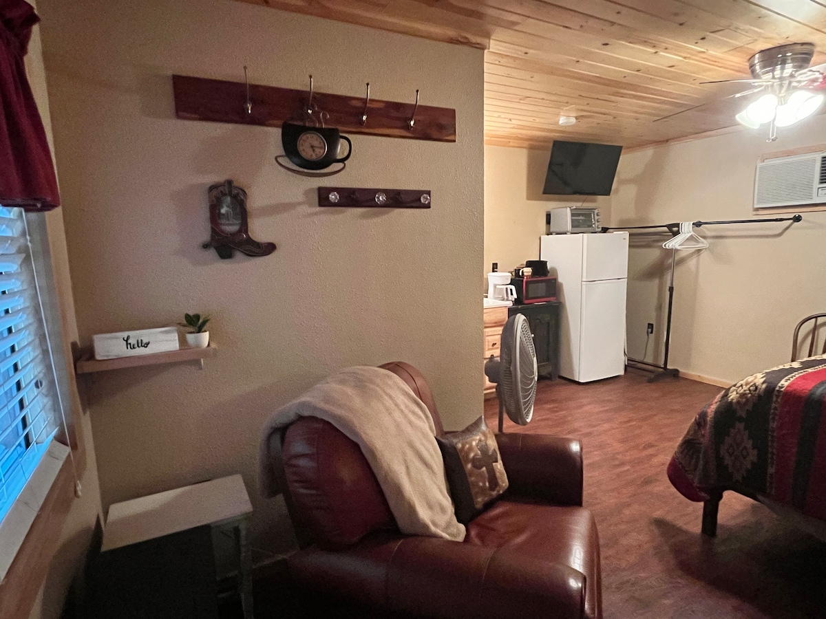 Umgomo wethu ukumema ukuthi uthathe kalula kule ndawo yokuvakasha elula nepholile. Indlu eyakhiwe ngamapulangwe igumbi lokugezela elinendawo yokugezela, futhi isendlini efanayo nendlu eyinhloko nezinye izindlu zezivakashi. Uzonikezwa ubumfihlo. Sinikeza ifriji elincane, i-microwave, umshini wokwenza ikhofi nezinto zekhofi. I-Wi-Fi ne-Roku Tv yamahhala. Lena yindawo enhle yokuba uchithe ubusuku futhi uye entwasahlobo ebhodini lakho lasezintabeni, ujabulele i-Cowboy Capital of the world.