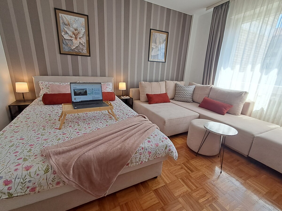 Yiba omunye wezivakashi zokuqala efulethini lethu elingamamitha angu-35 (375 square foot) endaweni enhle kakhulu. Umgwaqo othulile onezindawo zasemaphandleni nezihlahla ze-linden uzokunikeza ithuba lokuzwa umoya wakudala we-Novi Sad. Uzoba sendaweni enhle, eduze nomaphi lapho ufuna ukuba khona, kungakhathaliseki ukuthi uhlala ngebhizinisi noma ukuzijabulisa. Ifulethi lingamamamitha angu-600 (imizuzu engu-5) ukusuka endaweni yedolobha ephakathi. Izilimi ezikhulunywa: IsiNgisi, Isi-Serbia