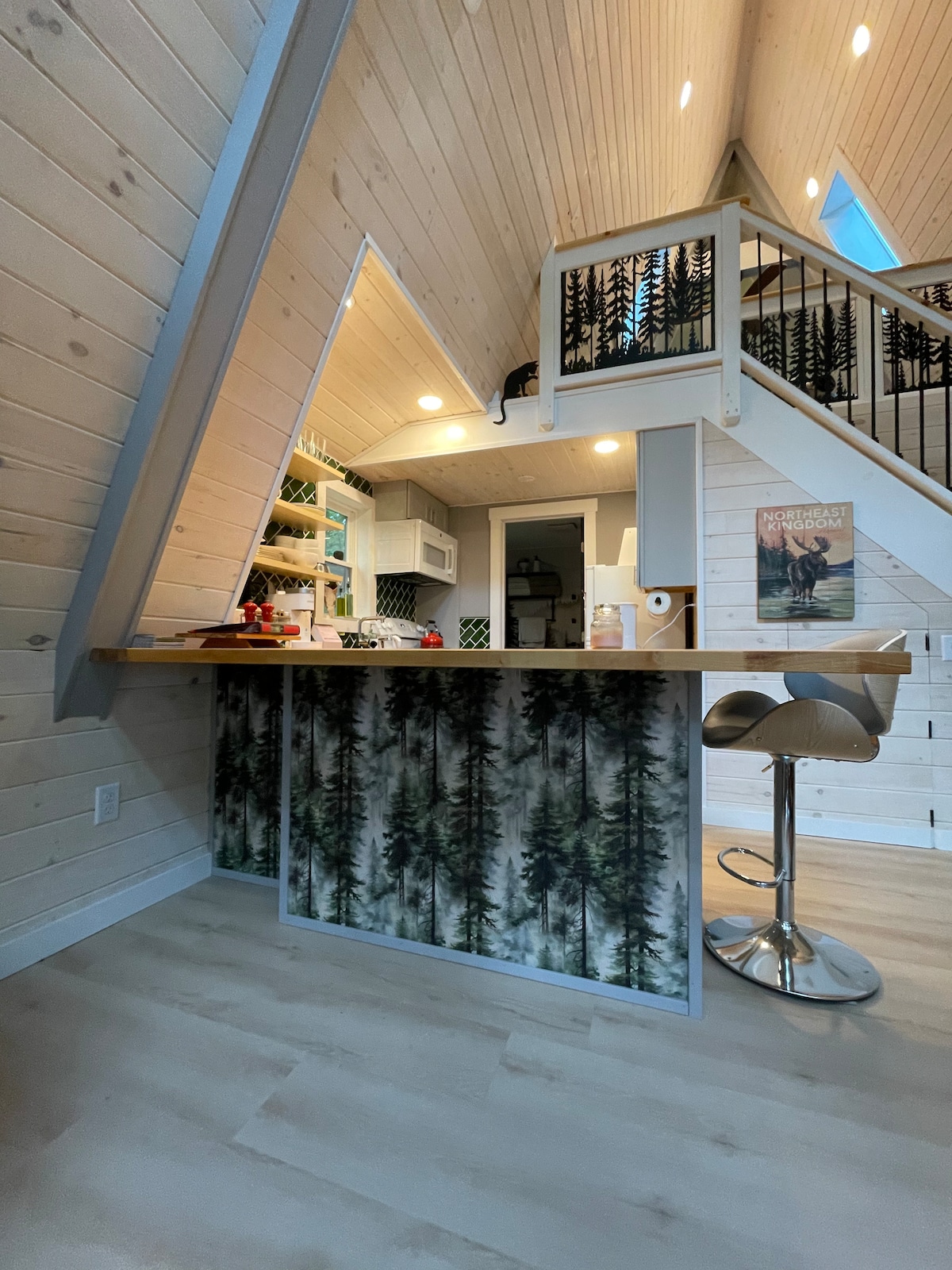 Siyakwamukela endlini yethu eyakhiwe esihlahleni, indlu eyakhiwe ngamapulangwe yesimanje ebheke i-Kenfield Brook ku-Terrill Gorge. Sisendaweni engamakhilomitha angu-5 ukusuka e-Stowe nezindawo zayo ezikhangayo, nemizuzu embalwa ukusuka enkabeni yedolobha i-Morrrisville nawo wonke amasevisi ayo. Phezulu nje emgodini wokubhukuda obabazekayo we-Cady 's Fall futhi ngaphesheya komfula usuka emizileni emangalisayo yamabhayisikili e-Cady' s Falls, indlu yethu eyakhiwe ngamapulangwe ihlezi phezu kwegquma. Ngomklamo wayo olula, omncane kulula ukugxila emvelweni futhi uzizwe usekhaya ezihlahleni.