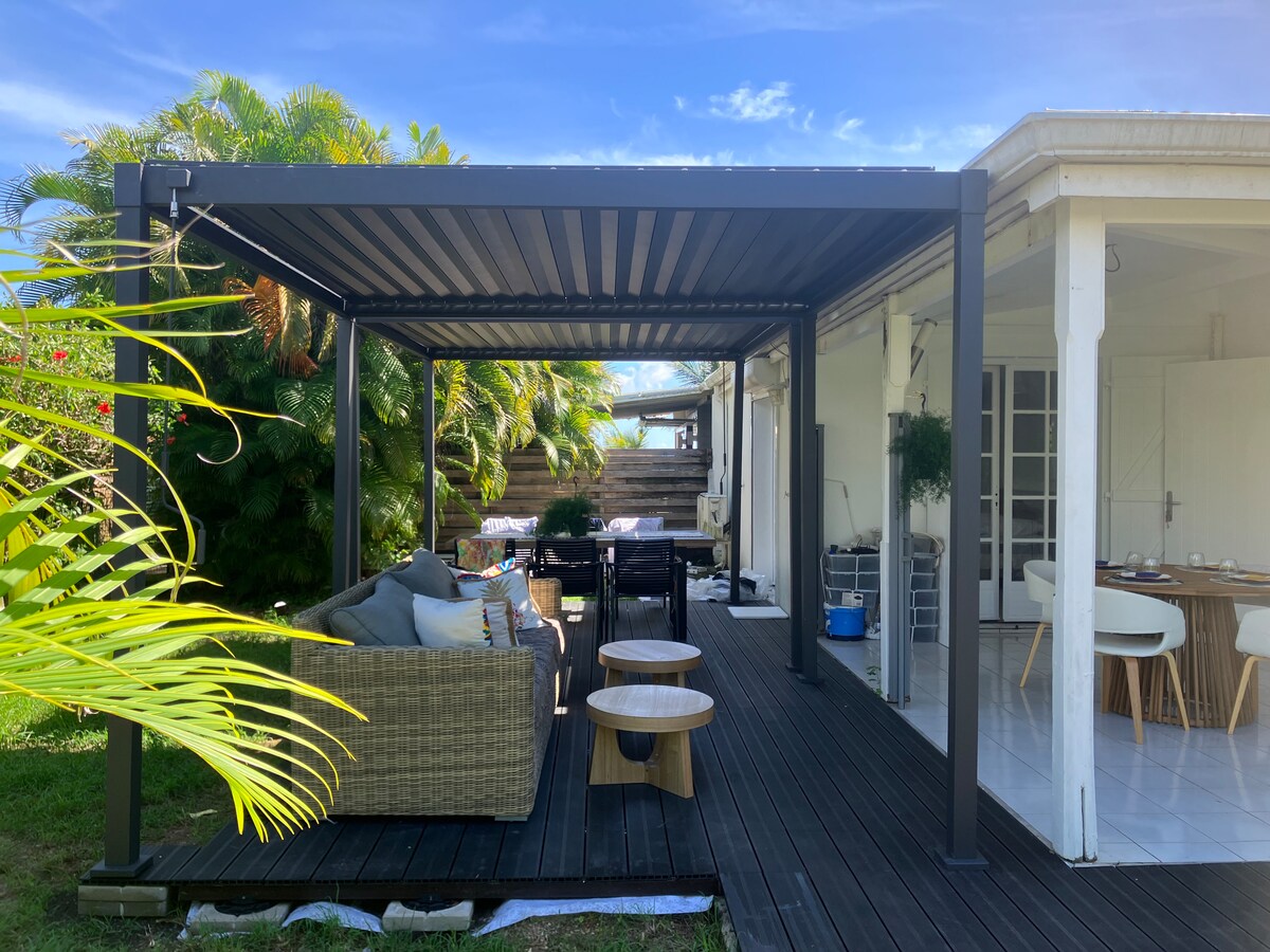 Villa Mango Mika, moderne et de plein pied. Impasse Mirano Kancel au Gosier. Secteur calme de Dampierre Position géographique centrale idéale pour découvrir la Guadeloupe Vaste pièce de vie de 50m2 avec cuisine US équipée et grand séjour ouverts sur 2 terrasses de 100m2 autour d'une piscine au sel de 7x4 m et un jardin tropical 3 grandes chambres climatisées : une suite parentale avec salle de bain privative et 2 autres chambres avec accès à une autre salle de bain et WC Wifi, parking gratuits