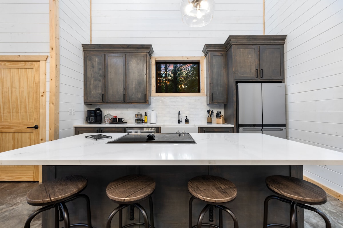 Ibhalwe ku-Stars Luxury Cabin iyindlu eyakhiwe ngamapulangwe yezithandani ekahle kakhulu! 🏠 🤩 Izindawo Ezimangalisayo! Indlu eyakhiwe ngamapulangwe kanokusho engu-30' phezulu ezindaweni eziphezulu. 💦 15' WOW walk-in shower kanye nobhavu we-clawfoot. 🧑🍳 Ikhishi lomklami elinesitofu segesi, isiqhingi, nezinto zikagesi ezisezingeni eliphezulu. 📺 Ama-Smart TV ngaphakathi nasemphemeni oyindilinga onendawo yokubasa umlilo yangaphandle. 🔥 Ubhavu wamanzi ashisayo onezibani ze-LED nesici sezimpophoma ukuze uphumule. 😴 Kulala izivakashi ezingaba ngu-4, kulungele abantu abashadile noma umndeni omncane. 🚫 🐶 Uxolo, izilwane ezifuywayo azivunyelwe