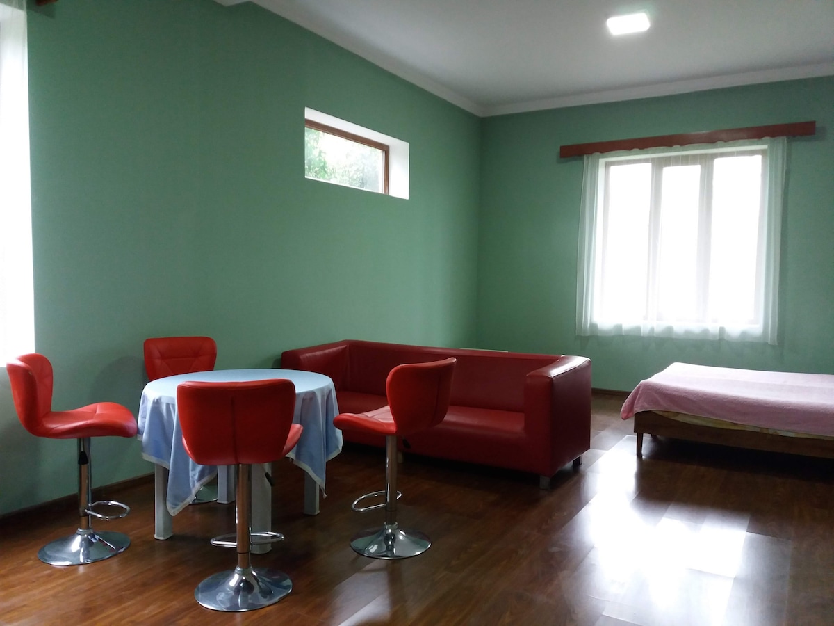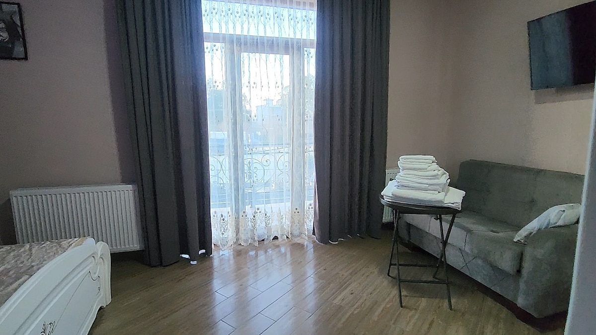 Maphakathi nedolobha elidala lase-Batumi, eduze kwe-Piazza. I-studio siqashisiwe ngendawo yokungena eseceleni egcekeni elihlukanisiwe. Ihlomele ngokugcwele ukuhlala kwesikhathi eside, kulokhu kutuswa abantu abangu-2 nomndeni onengane eyodwa. Kukhona igceke elinefenisha , ongayisebenzisa futhi - ngokwesibonelo, isidlo sasekuseni noma isidlo sakusihlwa egcekeni!) Izindawo zokulala - usofa osongayo nomatilasi 1600. Indawo yokuhlala yabantu abangu-2 - $ 50 ngosuku, indawo yokuhlala yabantu abangu-3-4 - $ 60 ngosuku. Ukuqasha kwesikhathi eside akunakuphikiswa.