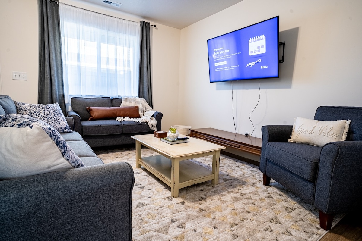 Jabulela yonke i-suite yethu entsha enefenisha enendawo yokungena eyenzelwe izivakashi kuphela nokupaka emgwaqweni endaweni enhle evuthiwe. Igumbi lethu elithokomele elithokomele elihle lihlanganisa i-50 ku-TV enamashaneli angu-285 ne-Roku. Jabulela indawo yomlilo kagesi elawulwa kude enemibala emangalisayo ne-thermostat eguquguqukayo. Pheka ekhaya ngekhishi elungele noma yikuphi ukudla. Khokhisa izinto zakho zikagesi nge-USB ne-USB-c yokushaja Outlet. Uma ufuna ubumfihlo obengeziwe ekamelweni lokulala elithulile bese uvula i-TV yesibili.