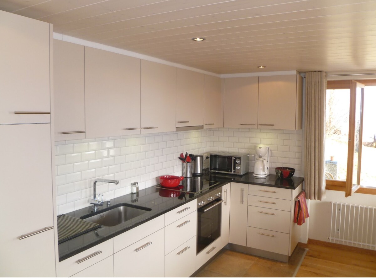 Phumula kule ndawo. Amakhilomitha angu-10 ukusuka e-Interlaken. Jabulela ukubuka izintaba namachibi. Amathuba amaningi okuhamba ngezinyawo nohambo oluya e-Bernese Highlands. Indawo ethulile yokuhlala yezivakashi ezithulile. INDLU ENGABHEMI: Akubhenywa ngaphakathi kwefulethi/kuvulande (okuhlanganisa i-hookah) NGENA kusukela ngo -5:00 pm - 9:00 pm, PHUMA kusukela ngo -7:00 am. Ifulethi elingu-3 1/2, amakamelo angu-2/umbhede ongamasentimitha angu-160 Ikhishi elinendawo yokuhlala/igumbi lokugezela eline-shower nethoyilethi Uvulandi Indawo yokupaka yamahhala