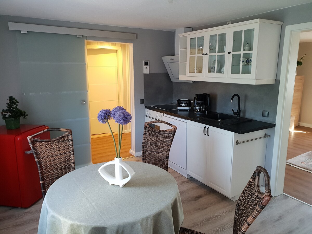 Ifulethi elinakho konke ( 54 m²) lisendaweni enhle ,ethulile futhi emaphakathi nenkaba yedolobha i-Bischofswerda. I-BIW iyisango eliya e-Upper Lusatia futhi kuyisiqalo esikahle sokuqwala izintaba nokuvakasha Bautzen , Dresden and Saxon Switzerland. I-FW yesimanje ehlotshiswe ngesitezi sesibili; ikhishi elinakho konke linikeza ithuba lokuzenzela ukudla; i-WZ ene-satellite TV, (umbhede wosofa ababili); ikamelo lokulala lomuntu wesibili.;Ishawa/indlu yangasese; ukungabhema; i-Wi-Fi; azikho izilwane ezifuywayo