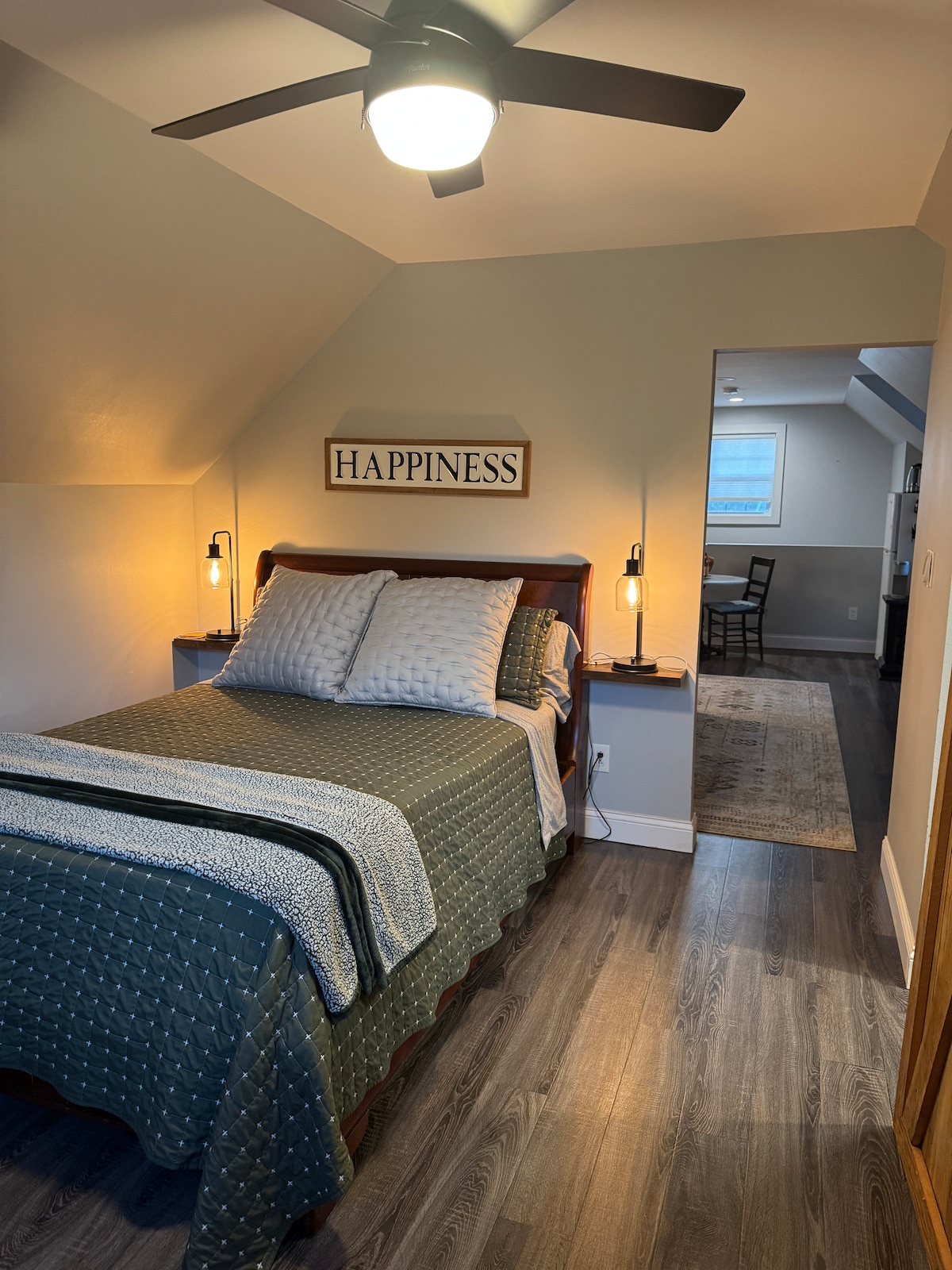 Siyakwamukela ku-loft yethu ethokomele enekamelo lokulala elilodwa, etholakala emizuzwini embalwa ukusuka e-I-70 futhi eseduze ne-Copper Dock Winery ne-Loveland Estates, elungele izivakashi zomshado. I-loft ihlezi ngaphezu kwegalaji elihlukanisiwe. Ngaphakathi, uzothola igumbi lokuphumula elithokomele, ikamelo lokulala elinombhede omkhulu, itafula elincane lasekhishini, i-microwave, ifriji/ifriji nomshini wekhofi we-Kuerig. Indawo yokupaka yangaphandle iyatholakala.
