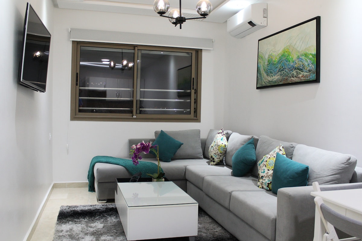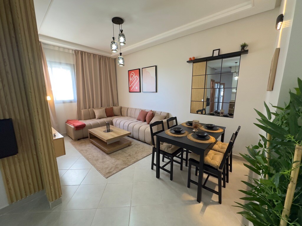Ashraf Home offers an exceptional luxury stay in a modern and refined apartment within secure residence with private Parking. Appart Recently renovated and tastefully furnished, it delivers premium comfort,Wi-Fi🛜 Ideally located, close to beaches, shops and cafes, 8 minutes from the airport, 2 min from the Grand Stadium, 5 min from Achakar Beach🌊 and 11 min from the city center. The features two spacious living rooms, a fully equipped kitchen, Bathroom and two elegant bedrooms, Book now ! 🎉