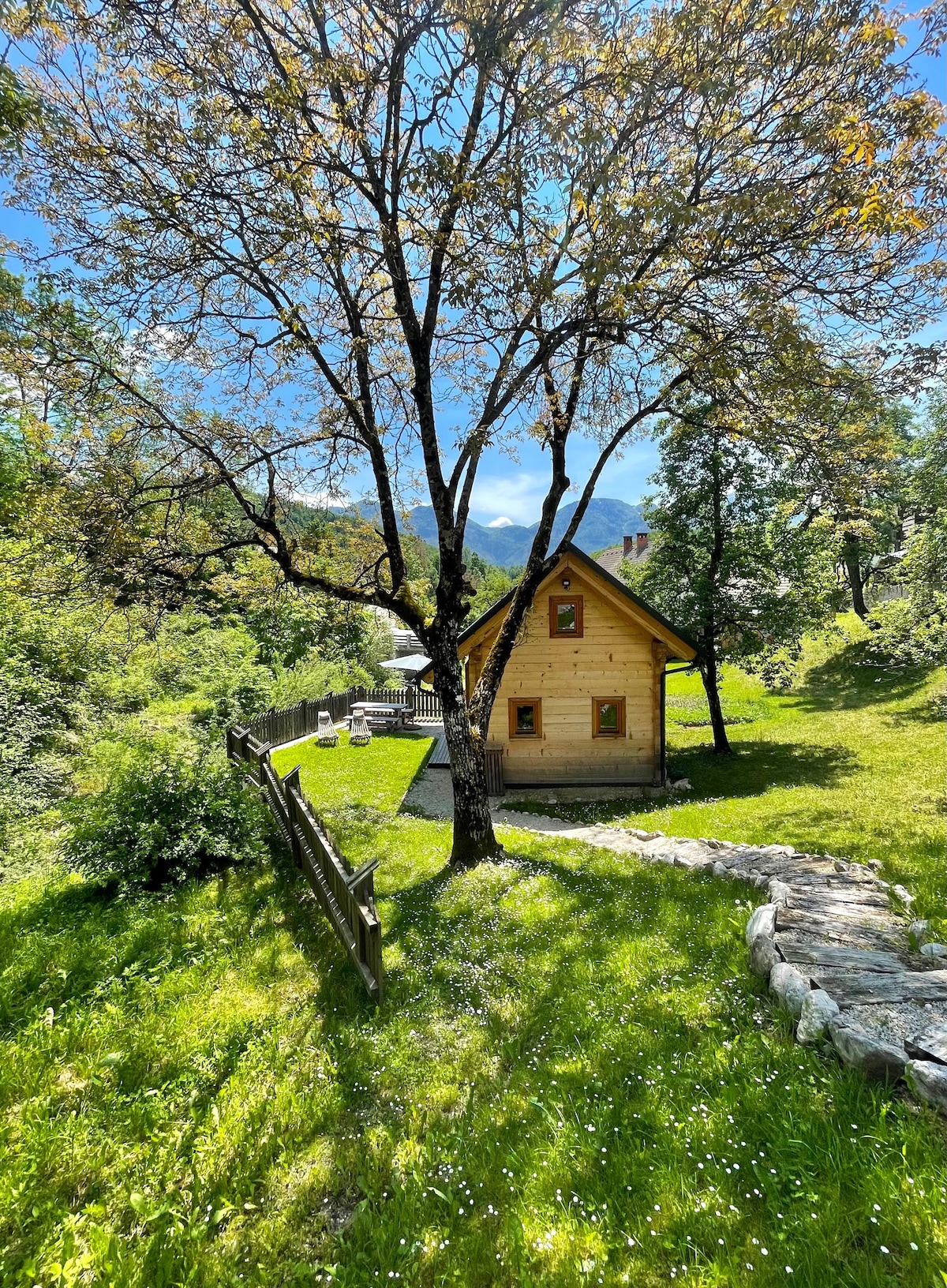 Enjoy the serenity of nature in our unique tiny home, just 20’ from Bled. Fall asleep with the murmur of the passing river, sunbathe on our wooden terrace right on the riverbank and take a dip in the outdoor viking tub in all seasons. Equipped for indoor and outdoor cooking, our charming house is hospitable to small and big humans alike, including a modular sauna, private beach and an outdoor cinema!