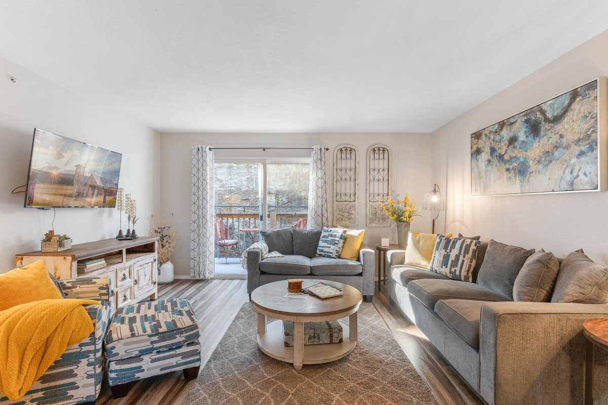 Le condo ingeyakho nomuntu wakho okhethekile! Thatha isikhathi sokuphumula nokuchitha isikhathi esidingekayo ndawonye! Amamayela angu-6 kuphela ukusuka e-Silver Dollar City Kanye enkabeni ye-Branson Beautiful, e-Missouri, le King Suite ethokomele ilungele ukuhamba izinsuku ezimbalwa. Nge-Wi-Fi yamahhala, i-Chrome Cast, ubhavu onama-jet, kanye nomshini wokuwasha nowokomisa kuyunithi, ungachitha isikhathi esincane noma esiningi ngaphakathi ngendlela ofisa ngayo! Ngokungena/ukuphuma okulula, itiye/ikhofi lamahhala, futhi azikho izitebhisi, akubi ngcono!