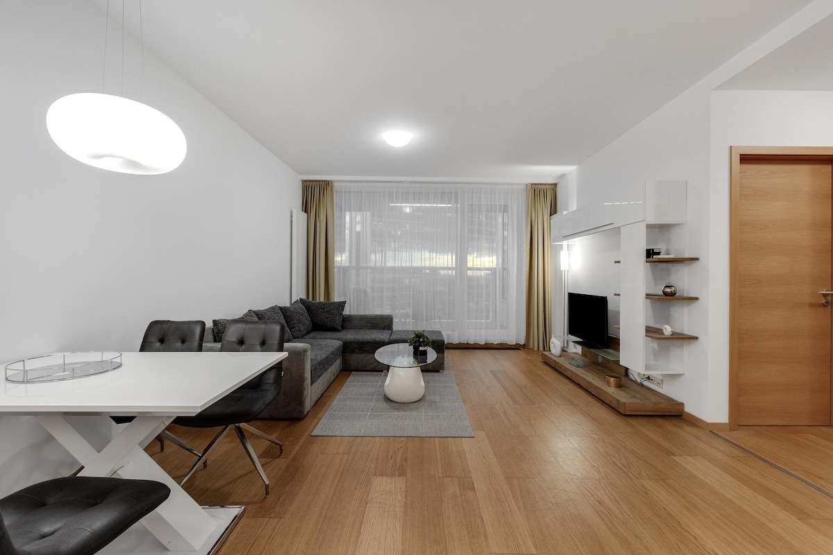 Siyakwamukela ku-Sky Nest enhle, esesitezi sama-22 - Ukuphila kwakho okunethezekile kwe-Eurovea tower! Leli fulethi elinekamelo elilodwa elinefenisha ephelele liyisakhiwo eside kunazo zonke futhi esidume kunazo zonke e-Slovakia futhi liza nokushona kwelanga okuconsisa amathe njalo kusihlwa (mahhala). Usenkabeni ye-Bratislava, unokufinyelela okuqondile e-Eurovea Mall, okusho ukuthi ukuthenga, ukudla, nokuhambahamba ngasogwini lomfula ngokuyisisekelo kuyiphaseji lakho elisha. Uthanda ubusuku bokuphola? I-brunch enobuvila? Ukudla kugijima ngama-slippers? Ukhaviwe.