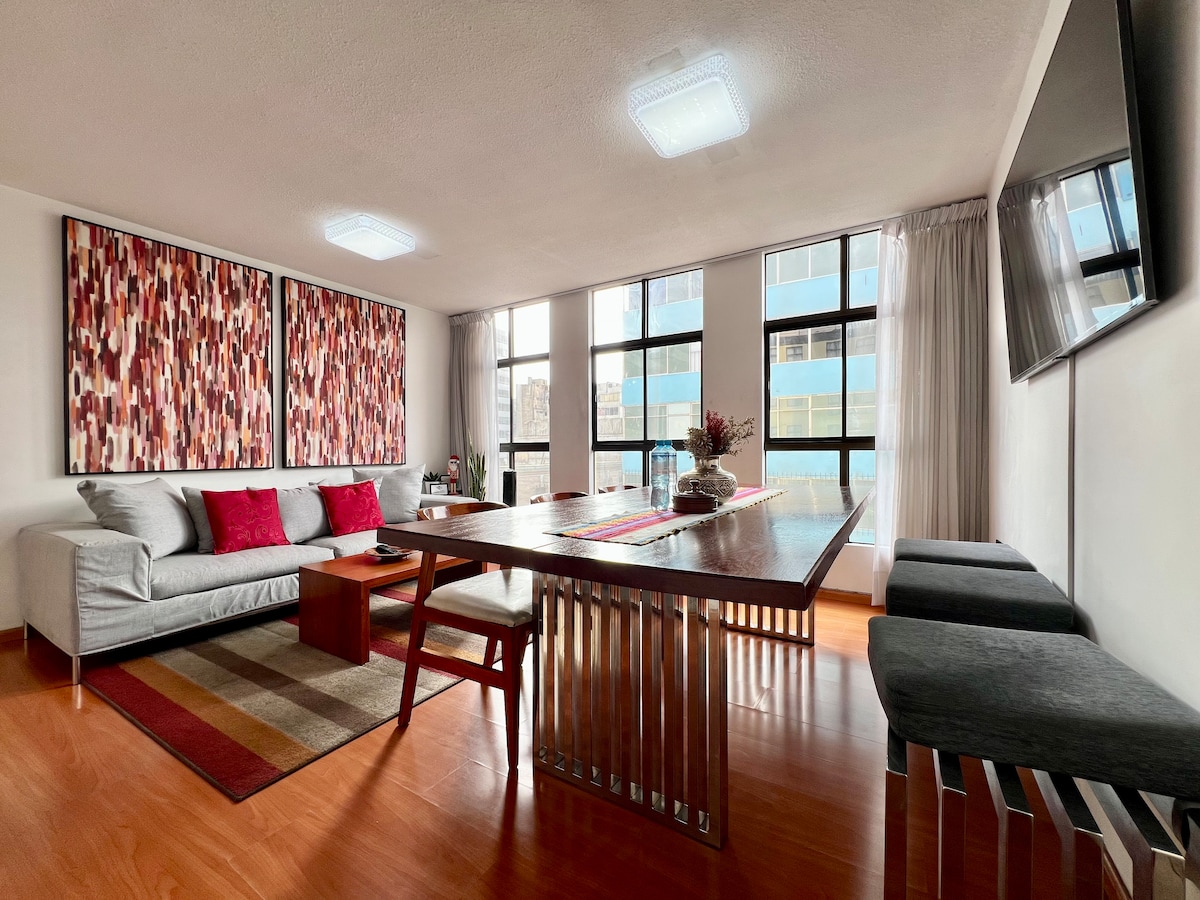 Zizwe usekhaya! Ifulethi eliphakathi nendawo elise-San Isidro eduze nazo zonke izindawo zezivakashi ezifana: Miraflores, Larcomar, Centro de Lima phakathi kwabanye. Sinakho konke okuseduze! Amabhange, izindawo zokudlela, izitolo ezinkulu, Izinxanxathela Zezitolo, Ezokuthenga, phakathi kwabanye. Sinombono omuhle we-San Isidro nokukhanya okuhle. Ngenxa yokuphawula kwakho, yithi kuphela esiba namafasitela okulwa nomsindo egumbini! ungawunaki umsindo wedolobha futhi ube nobusuku obumnandi ✨