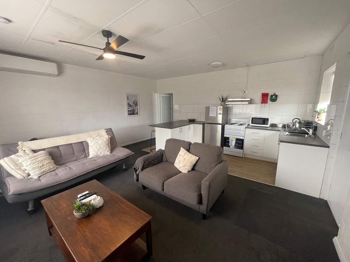 Ifulethi lethu liyiyunithi ehlanzekile yekamelo lokulala elilodwa eline-R/Cycle, isikrini esicaba se-42inch, i-ensuite yangasese, ifriji, indawo yokuphumula, . Itiye, ikhofi nokudla okulula nakho kunama-blinds, kuvikelekile ukupaka emgwaqweni, KANYE - ne-Wi-Fi yamahhala, i-Netflix. Eduze kakhulu nedolobha. ** Ifanele abantu abashadile noma umuntu oyedwa **
