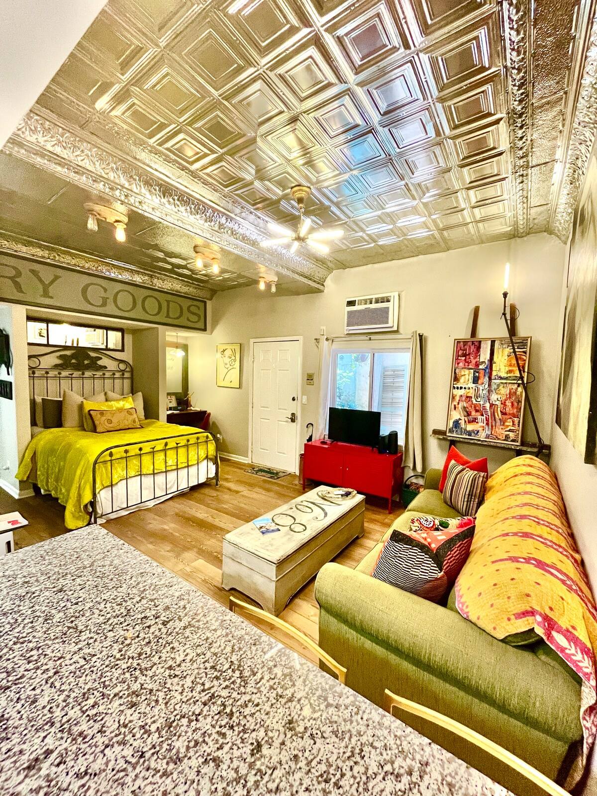 Indawo enhle yedolobha eliphakathi nendawo! Iza nendawo yokupaka!- akuvamile enkabeni yedolobha! Isitudiyo esithokomele, esithokomele esinosilingi wethini, esihlotshiswe ngamaciko esakhiweni se-Historic McClellan Livery sango-1914 endaweni engcono kakhulu edolobheni! Isakhiwo esiphephile nesinezitezi ngesitayela esidala sase-New Orleans. Hlola konke okungokomlando edolobheni futhi ungalokothi ungene emotweni yakho! Simane nje sihamba ngezinyawo sisuka e-Riverwalk enomlando, izindawo zokudlela ezinhle, izitolo, amamnyuziyamu, izindawo zokwenza utshwala, nokuphila kwasebusuku.