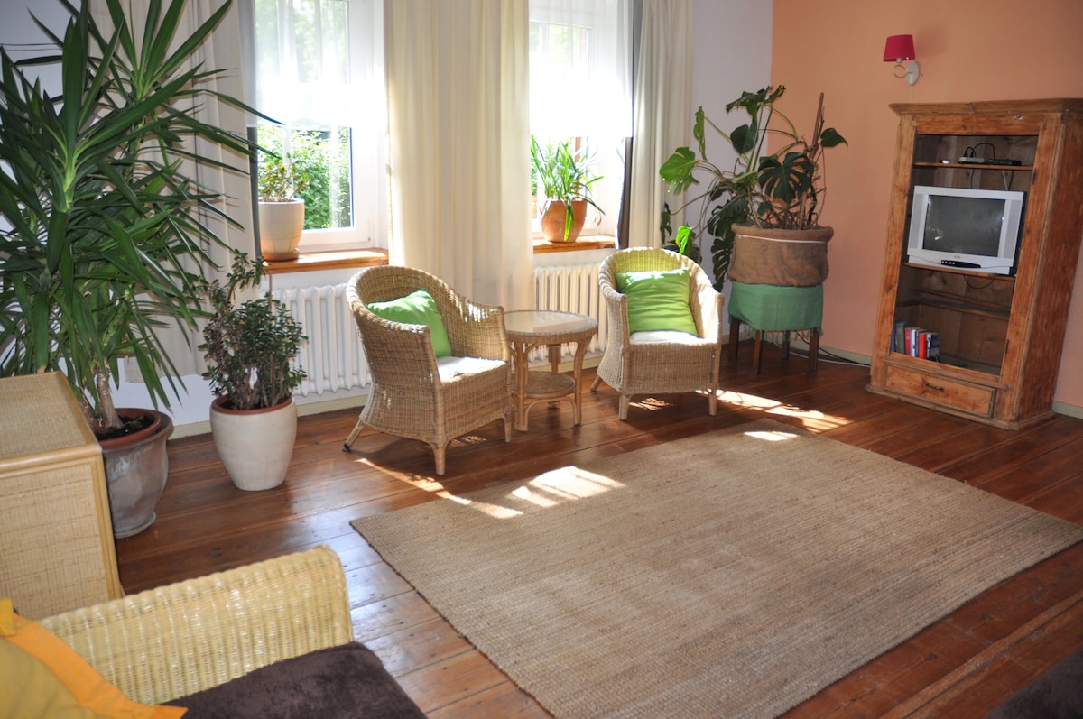 Old house located by Oder Neisse bicycle path and short drive from highway 11. The ONE ROOM flat has separate entry, own garden and easy access to the village lake with the small beach. The house is located in a peaceful village. Free use of 2 kayaks (single and double) and bicycles. No EV charging facility. Plant based meals are served (each €12) - English breakfast and the evening meal.