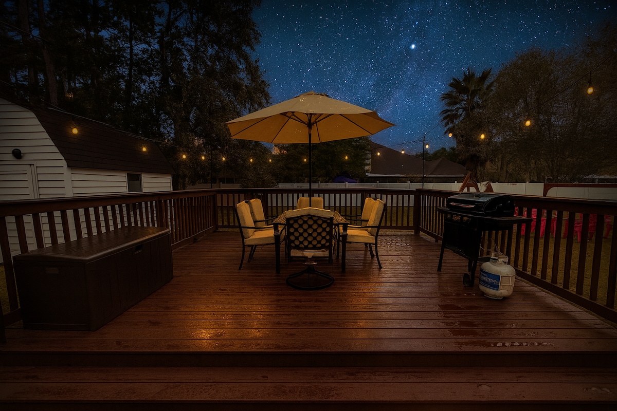 Jabulela kuleli khaya elinokuthula ukuze uhlale phezu kuka-acre angu-1. I-15 Min ukusuka e-River Street, 30 Min kuya e-Tybee Island, amaminithi angu-5 kuya ku-Red Gate Farms kanye nemizuzu engu-15 ukuya esikhumulweni sezindiza. Leli khaya elinamakamelo angu-3 elithandekayo lilala abantu abangu-8 namagumbi okugezela angu-2 agcwele. Kunosofa olele umatilasi othuthukisiwe ukuze uthokomale. Igumbi lokuphumula nekamelo ngalinye line-smart TV ene-WiFi. Igceke elingemuva linomgodi womlilo ne-BBQ. Paka egalaji lemoto elingu-2 elinomshini wokuwasha nowokomisa. Abantu abangaphezu kuka-8, ungabi namaphathi. Lena yindawo enokuthula yokungcebeleka e-Savannah.