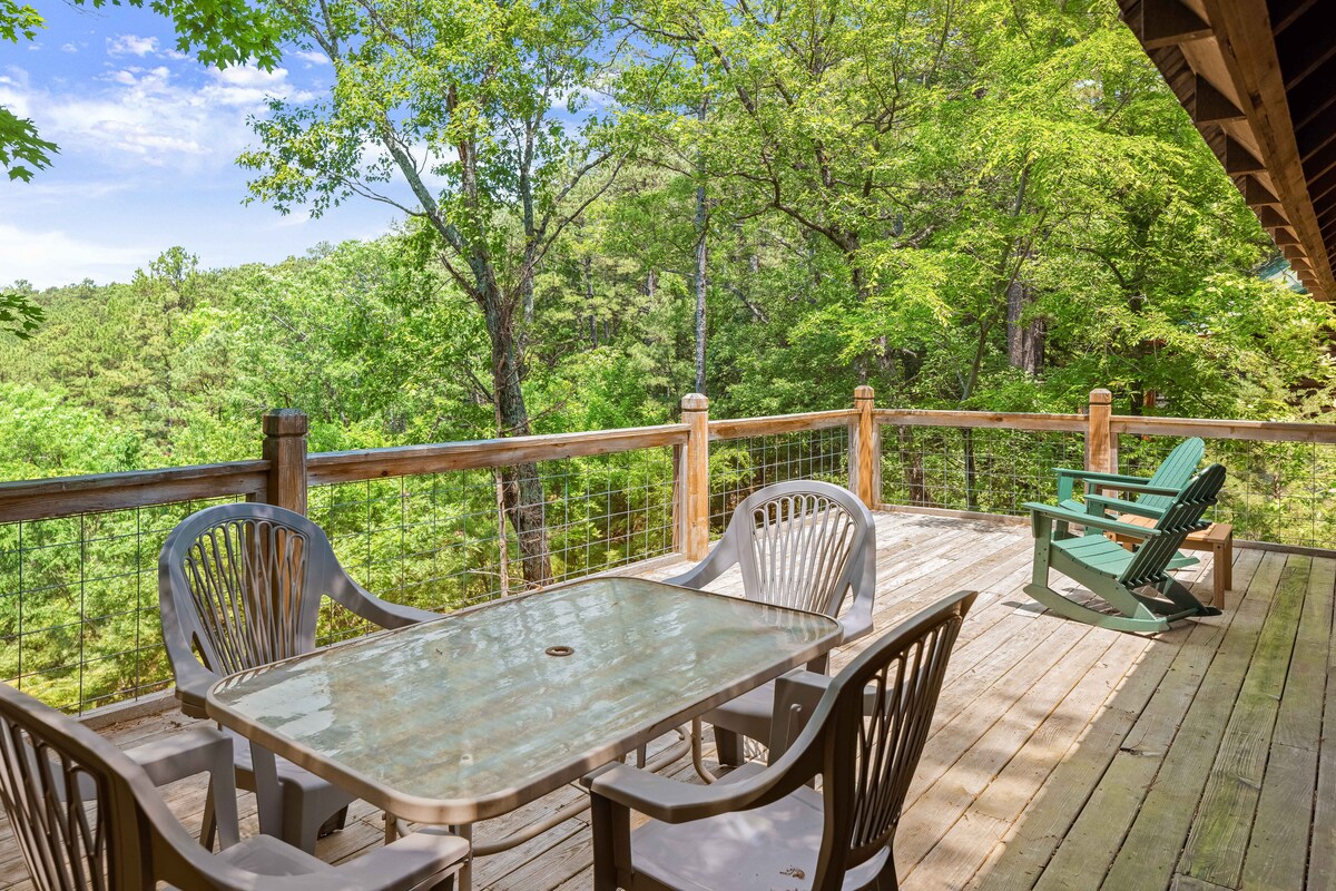 Indlu eyakhiwe ngamapulangwe enombhede ongu-2, ubhavu ongu-2 enkabeni yase-Ozarks nase-Eureka Springs! * Indawo yokuhlala eyi-18-acre ehlathini imizuzu engu-11 kuphela ukusuka eBeaver Lake nemizuzu engu-7 ukusuka eLake Leatherwood. * Jabulela ikhishi eliphelele, idekhi yangasese yangemuva, ukubuka isigodi esihle * Ubhavu we-Jacuzzi onendawo yokubuka ifasitela * I-WIFI * I-smart TV engu-50" enokufinyelela ku-Netflix ifakiwe. * Indawo yomlilo kagesi. * Kunikezwe ikhofi elithosiwe endaweni. * Imizuzu yokuhamba ngezinyawo, imizila yamabhayisikili asezintabeni * Amamayela angu-5 ukuya edolobheni elinomlando elingaphansi kwe-Eureka Springs.