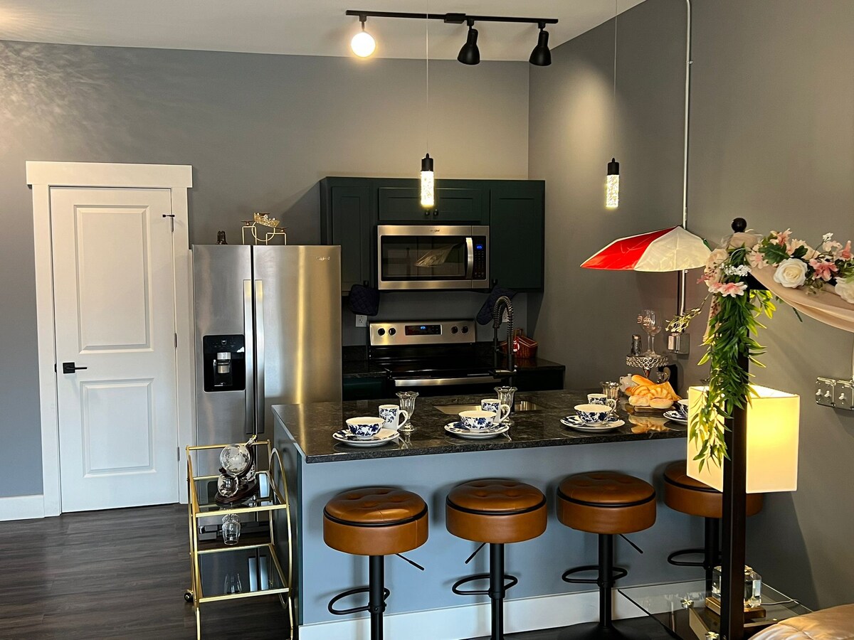 Phumula ngenkathi usebenza noma usebenza ekuphumuleni. I-Kenton Suite iphelele. Itholakala enkabeni yedolobha elingokomlando i-Urbana. Izindawo zokudlela, izitolo zakudala, imidlalo yaseshashalazini, nezitolo zokudlela zonke ziqhelelene kalula. Ifulethi lethu lase-Kenton Suite lihlotshiswe kahle futhi likhululekile ngempelasonto noma ukuhlala isikhathi eside. Indawo yokungena yangasese ikunikeza ukushintshashintsha nezimo kokuza nokuhamba ngendlela othanda ngayo. I-Wifi esheshayo yomsebenzi. I-veranda yangasese ngaphandle komnyango wakho ukuze ujabulele ukubuka igceke elihle.
