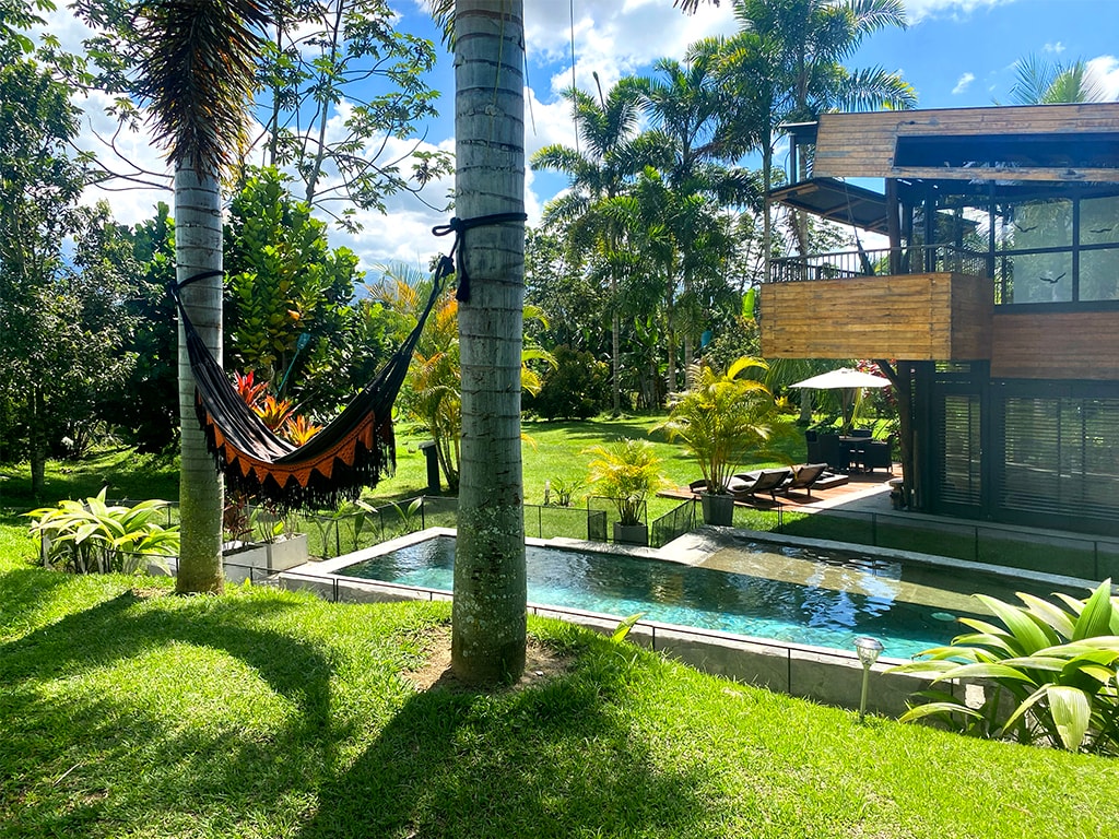 Moderna y amplia casa en medio de la naturaleza; atención especial a los detalles y al diseño interior con un concepto boho. Cuenta con 2 habitaciones espaciosas (una de ellas con una cama-nido adicional), cada una con baño privado y ducha exterior al aire libre. Gran sala comedor, cocina con: estufa, lavaplatos, nevera, air-fryer, vajilla. Amplia terraza que rodea un confortable jacuzzi climatizado, frente a un espectacular cultivo de café, el cual puedes disfrutar como cortesía.