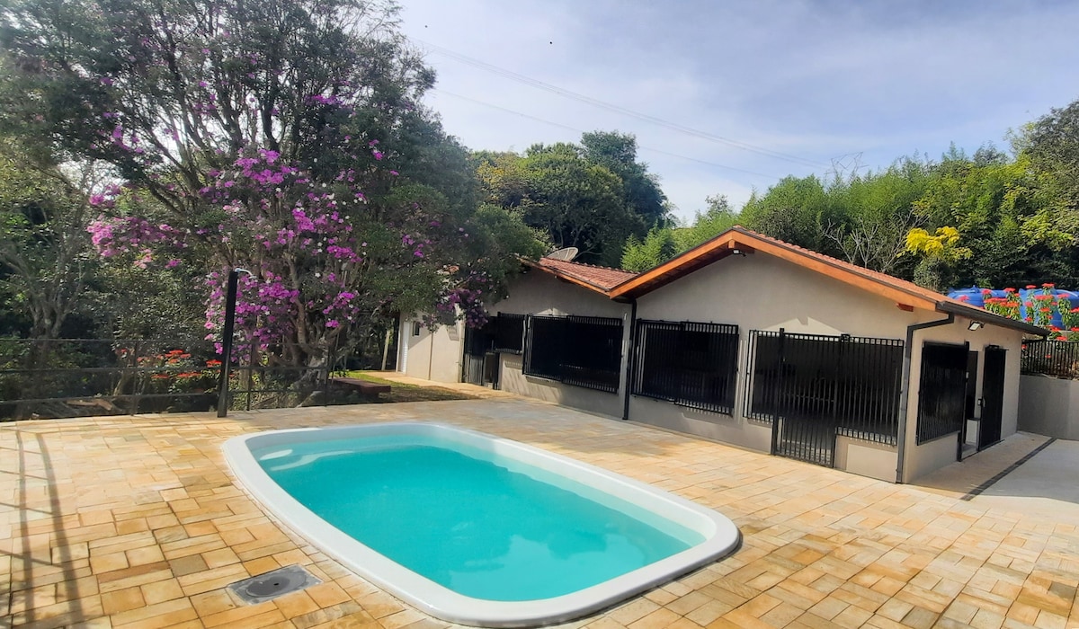 Ipulazi elithokomele eliyimizuzu engu-8 ukusuka enkabeni yedolobha i-Caldas futhi eduze ne-Poços de Caldas, elungele abantu abangaba ngu-15. Inendawo yokubhukuda, indawo yokosa inyama, igumbi lemidlalo nengadi yezithelo, elungele ukuzilibazisa nokuzijabulisa. Itholakala phambi kwe-Estrada Real Winery futhi iseduze ne-Vitácea Brasil Group nezindawo zokudlela ezinhle. Inamakamelo okulala angu-3, amagumbi okugezela angu-3, i-Wi-Fi, i-Smart TV nekhishi eligcwele, okuqinisekisa ukunethezeka, ukuphumula nokuzijabulisa phakathi kwemvelo.