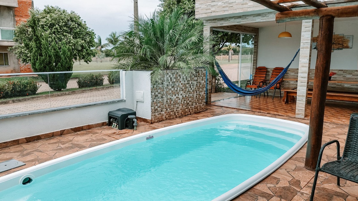 Casa com ambiente de praia mas no campo,ampla e adaptada para todos,sejam idosos,cadeirantes,sem escadas e poucas rampas,salão principal se unifica com área da piscina e churrasqueira,assim nem o churrasqueiro fica excluído da festa,no inverno tbm tem um bom espaço utilizável já que a churrasqueira é interna,todos quartos com suítes climatizadas,e ainda um banheiro próximo à piscina.