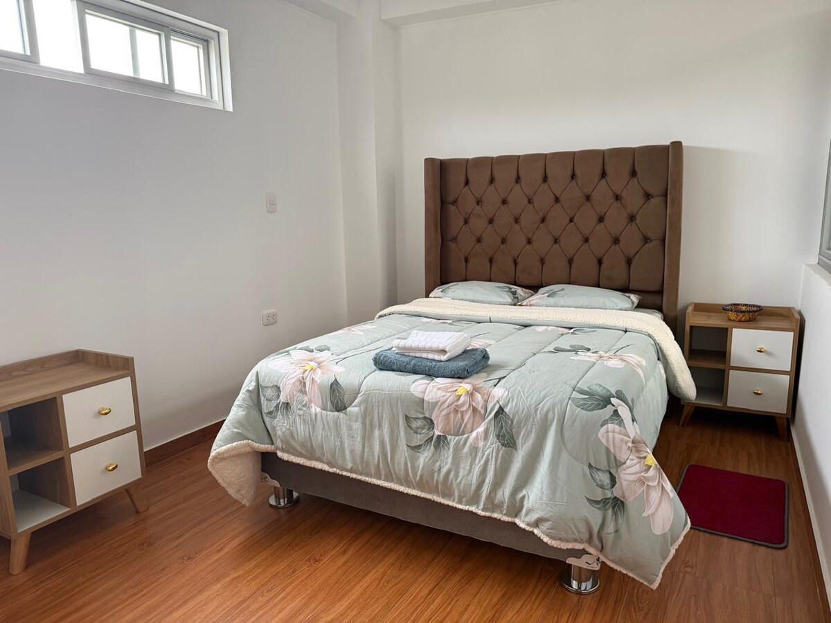 "Ifulethi elinamakamelo angu-2 elinendawo enhle enkabeni ye-Chachapoyas" - Imibhede emibili engu-3 - umthamo osuka kubantu abangu-1 kuya kwabangu-6 - i-smart 70"TV _ 4th floor - ikhishi elinezitsha - Jabulela ukuhlala okunethezekile nokunethezekile efulethini lethu okubukeka kahle kwedolobha. Indawo yethu yokuhlala iseduze nakho konke okunye., Imakethe, i-Mirador luya urco, njll. imizuzu engu-10 nje ukusuka esikhumulweni sezindiza. Ilungele labo abafuna indawo yokuhlala enezidingo zabanokukhubazeka nethokomele.