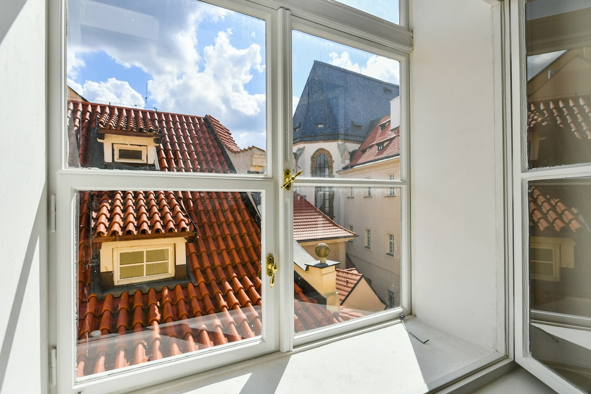 ☆ Panoramic view of the Charles Bridge Tower ☆ Distance to a tram station - 2 mins ☆ Soundproof windows ☆ Supermarket and ATM in the house ☆ Comfortable bed ☆ Large rooms with high ceiling Take an ultimate experience to stay in a exquisite apartment connected to the famous Charles Bridge. The 14th house is a cultural heritage. The newly redesigned flat is a mix of timeless elegance and luxury. The flat is surrounded by nice restaurants and famous sights, all within a walking distance.