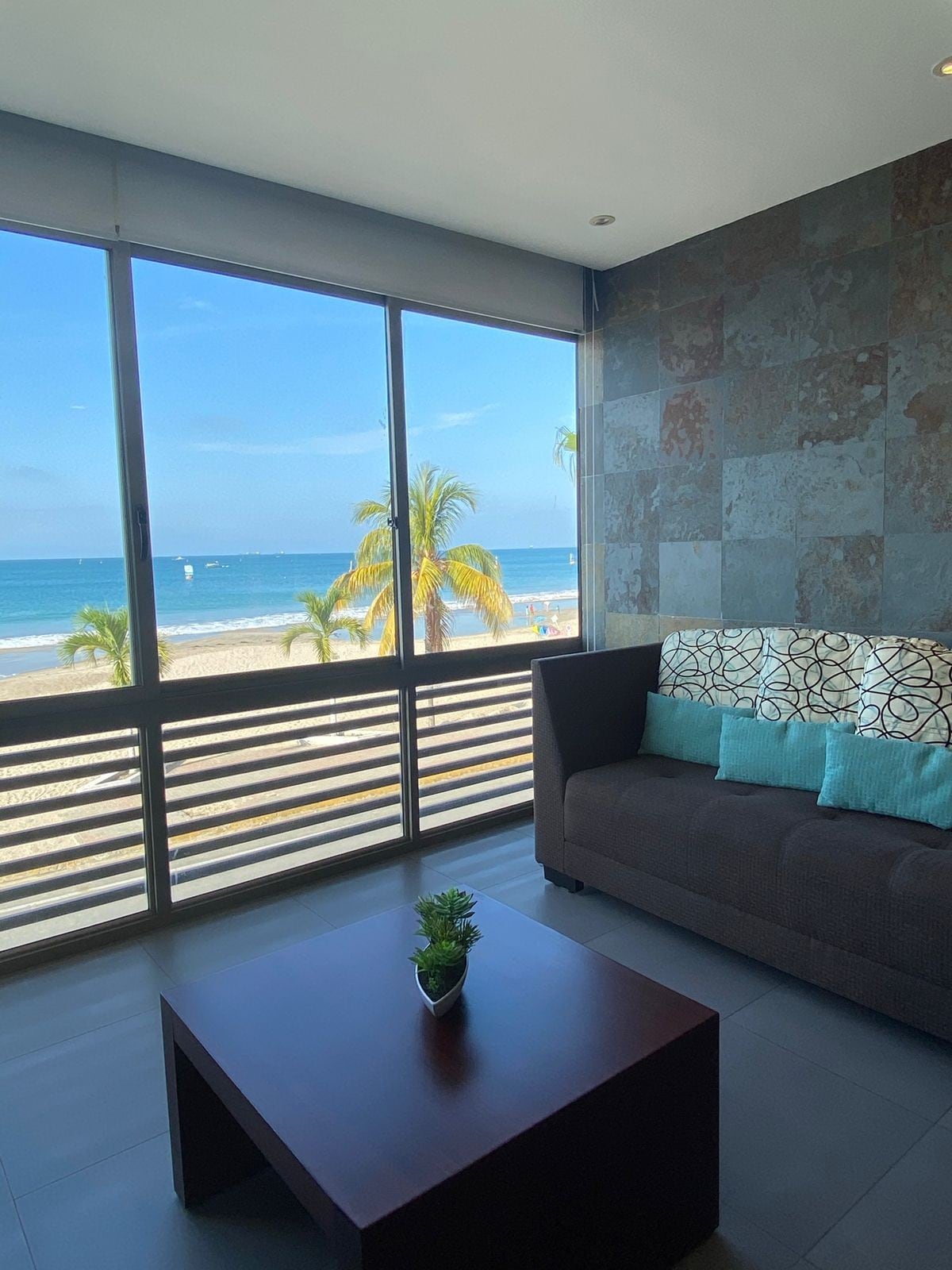 Beautiful spacious apartment in front of the beach. Wonderful ocean view. Located at Malecon Principal of Salinas, close to bars and restaurants. You can enjoy the sea with multiple activities such as swim, waverunner, boat ride, water parks and water sports. Reservations over 28 years old... PARTIES PROHIBITED