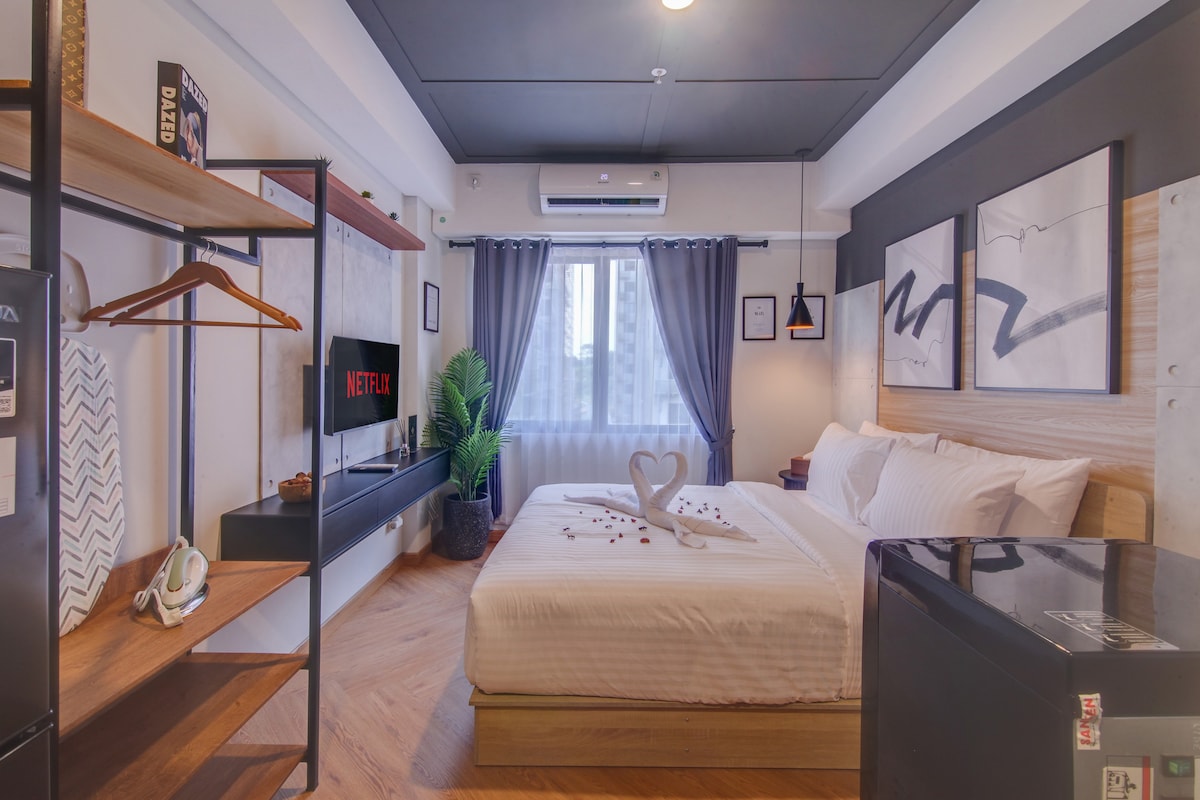 Sawubona-speed wifi. I-Netflix. Isaphulelo sokuhlala isikhathi eside! 🚭 Okuwukuphela kwekamelo eliyingqayizivele elingu-2 BR elinomklamo we-chic wezimboni. Kungakhathaliseki ukuthi uhlala ebhizinisini noma ekuvakasheni kwangempelasonto, sizoqinisekisa ukuthi uhlala kamnandi. Le yunithi YOKUZISEBENZELA ENGABHEMI etholakala ku-32nd fl, iqhayisa ngombono omangalisayo we-Bekasi landscape, umgwaqo ophakeme we-MBZ kanye ne-LRT + isitimela esiphezulu. Inogesi we-2200 watt, ye-2 AC, ifriji kanye nezitsha zasekhishini eziphelele zabantu abangu-4. I-Lagoon Mall ingaphansi kwefulethi ngokuqondile. Indawo yokupaka AYIKHO mahhala.